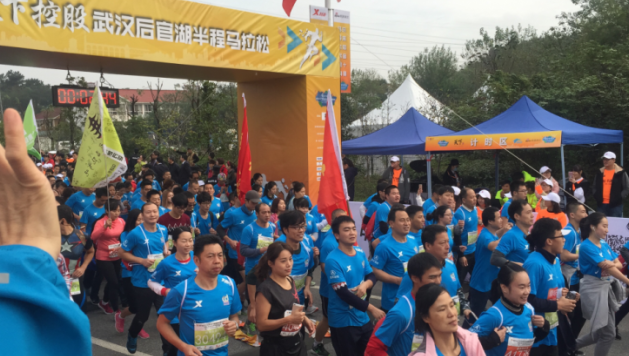 當(dāng)時鐘快指向八點半時,比賽現(xiàn)場人頭顫動歡呼聲一片,緊接著只聽見發(fā)號令槍一響,所有參賽人員像草原上奔騰的駿馬如潮水般的涌向整個跑道,布滿了整條5公里長的五賢路賽道,猶如一片藍色的海洋。參加健康跑的參賽人員跑到5公里處完成比賽,然后折返主會場觀看半馬比賽,為所有參賽者鼓勁加油!