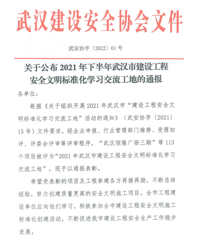 此次獲評“2021年下半年武漢市建設(shè)工程安全文明標(biāo)準(zhǔn)化學(xué)習(xí)交流工地” 稱號,不僅是對武漢花博匯十二花坊項(xiàng)目部(二期)安全管理和文明建設(shè)水平的肯定,也有力彰顯了公司企業(yè)形象,希望其他項(xiàng)目能多向做得好的項(xiàng)目學(xué)習(xí),做到高標(biāo)準(zhǔn),嚴(yán)要求,做品牌項(xiàng)目,打造公司口碑,將項(xiàng)目做成標(biāo)準(zhǔn)示范工程!