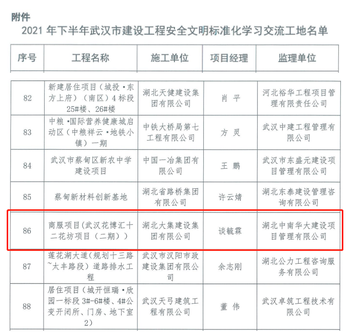 近日,經(jīng)過申報(bào)、行業(yè)主管部門推薦、受理初評、評委會評審等多項(xiàng)評審程序后,集團(tuán)公司承建的武漢花博匯十二花坊項(xiàng)目(二期)獲評“2021年下半年武漢市建設(shè)工程安全文明標(biāo)準(zhǔn)化學(xué)習(xí)交流工地” 稱號。