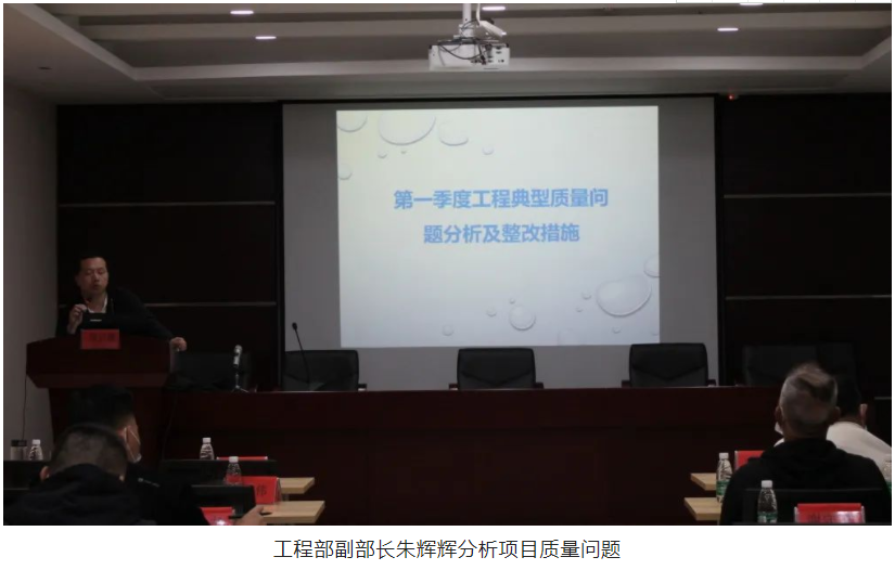 隨后,會議進入質量、安全隱患分析環(huán)節(jié),工程部副部長朱輝輝及安全主管秦春波采用PPT通報問題的方式,照片配合講述,更直觀的把項目質量、安全隱患問題展現在大家面前,朱工和秦工結合項目現場存在的質量、安全問題,著重分析了問題產生的原因以及現場的安全管理情況,并逐一對各項目提出了相應的整改措施。