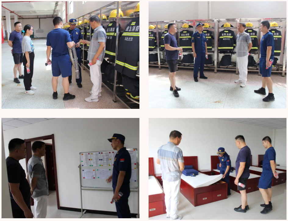 大集消防救援站教導(dǎo)員盧志帶著大家參觀了消防裝備庫(kù)及消防官兵備勤室,參觀中,集團(tuán)公司副總經(jīng)理徐家富與盧教導(dǎo)員進(jìn)行了深入交流,詢問(wèn)官兵們的日常生活及工作情況,并向高溫下堅(jiān)持訓(xùn)練、持續(xù)工作的他們表示敬意。