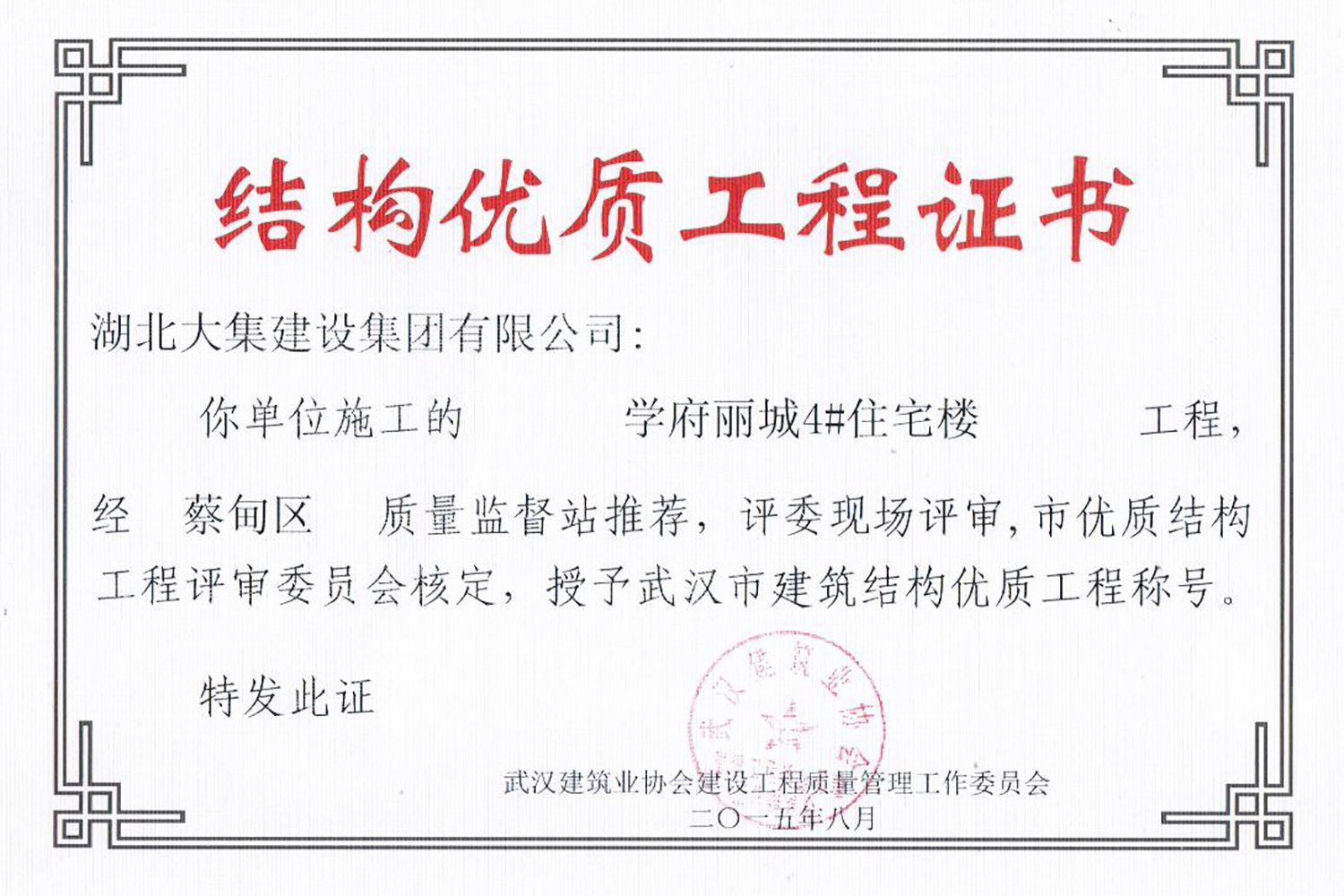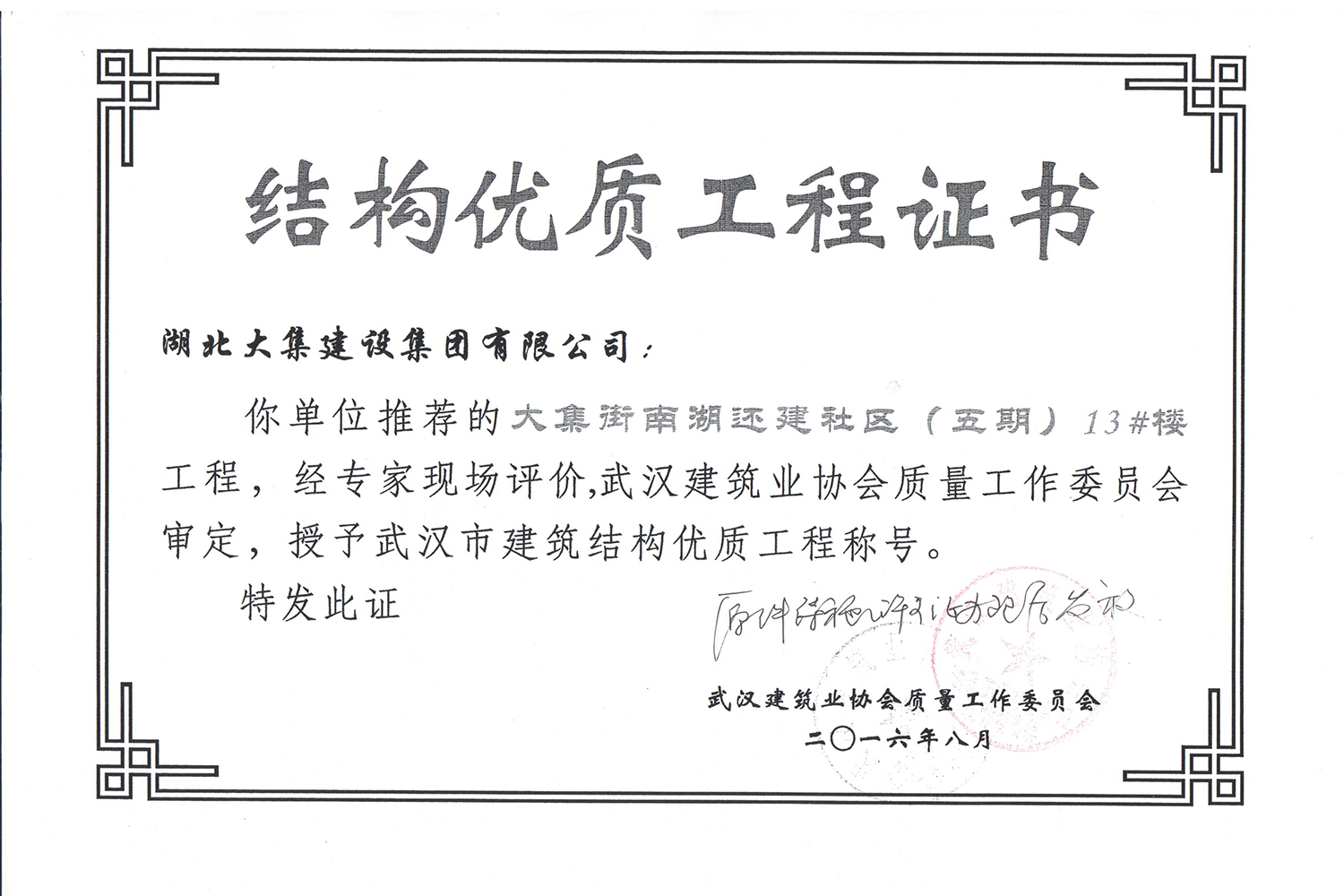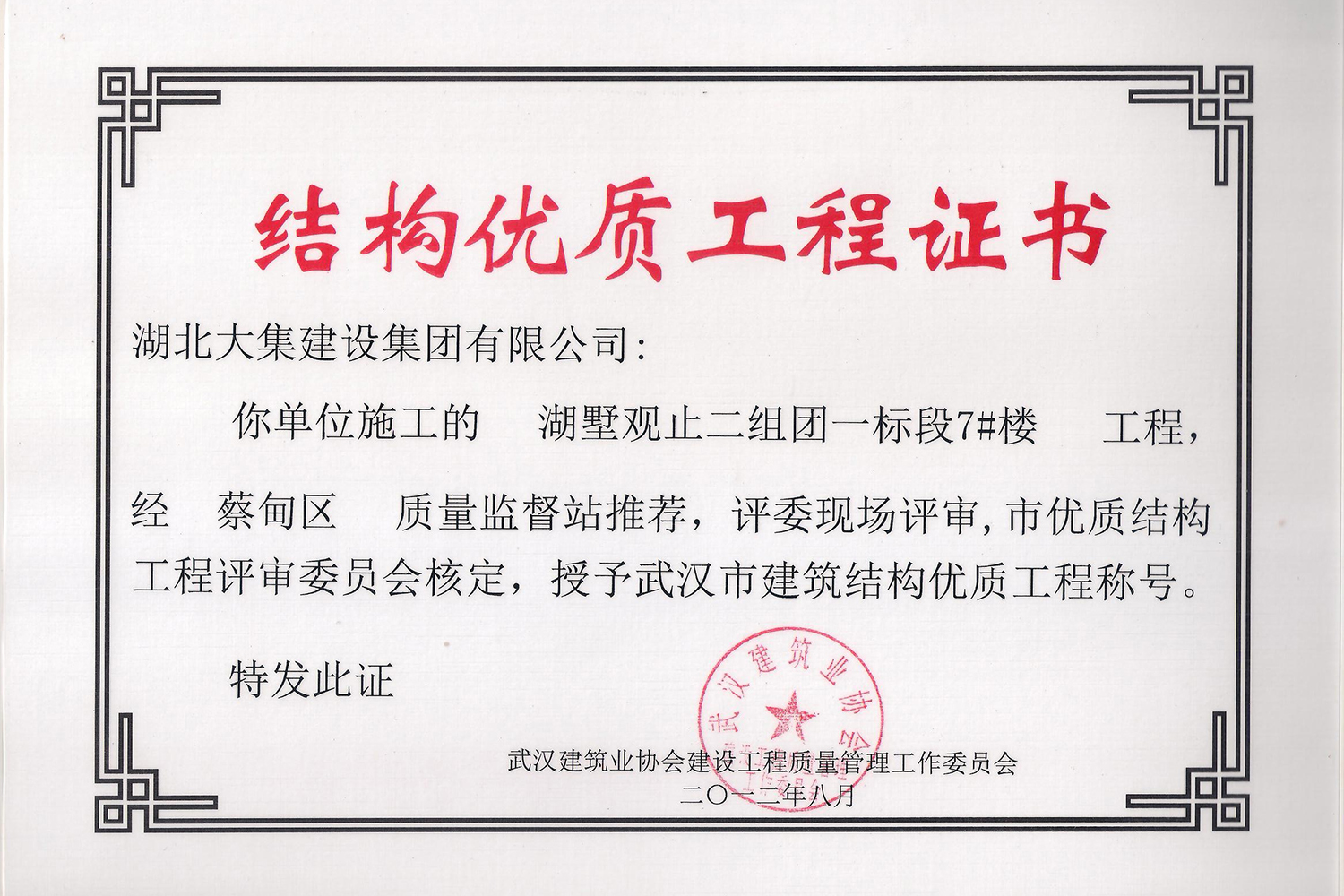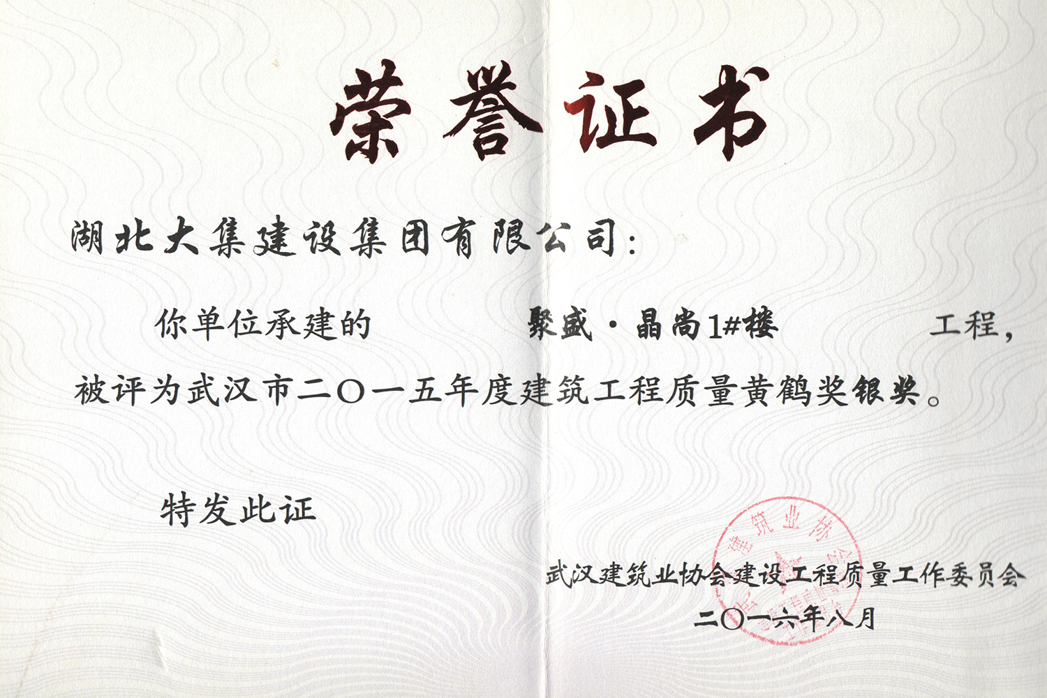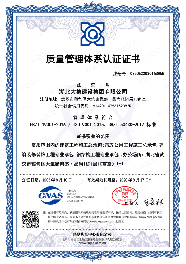 集團秉持“安全是紅線,質(zhì)量是品牌,文明施工是形象”的企業(yè)宗旨,不斷加強全面管理,注重提高自身素質(zhì),以完美的履約、優(yōu)良的質(zhì)量、滿意的服務,贏得了信譽。近年來,湖北大集建設集團先后與中石化集團、中鐵上海工程局、中建八局、中鐵十二局、碧桂園集團、世茂集團、綠地集團等央企、國企、地方標志性建設單位合作,先后承建了“碧桂園知音豪庭”項目、“碧桂園光谷云境”項目、“大集G區(qū)蓮溪花園”項目等多個高層住宅小區(qū);承建了世茂龍灣46#、47#、48#地塊、花博匯桃李春風二期等多個精品高端別墅群項目;承建了“南湖中學”、“南湖小學”、“南湖幼兒園”、“博奧幼兒園”等多個教育配套項目;承建了“孝感英眾超算終端科技產(chǎn)業(yè)園”、“鴻盛華全球航空服務產(chǎn)業(yè)園”、“盟盛汽車產(chǎn)業(yè)園”、“中原印務晶毅”等多個具有特殊設備安裝需求的鋼、混結構工業(yè)廠房項目;承建了“常福商務廣場”等大型商業(yè)綜合體;承建了后官湖綠道二期、三期,常貴路西延伸段、黃星大道等多條大型道路市政項目;自主開發(fā)了“聚盛晶尚”住宅項目,改善人居環(huán)境,引領綠色棲居新領域;所有工程嚴格執(zhí)行施工作業(yè)全過程質(zhì)量、安全管理,多個項目被省、市級監(jiān)管單位授予“省結構優(yōu)質(zhì)”、“省安全文明施工現(xiàn)場”、“市結構優(yōu)質(zhì)”、“市安全文明施工示范項目”、“樣板工地”等榮譽稱號。