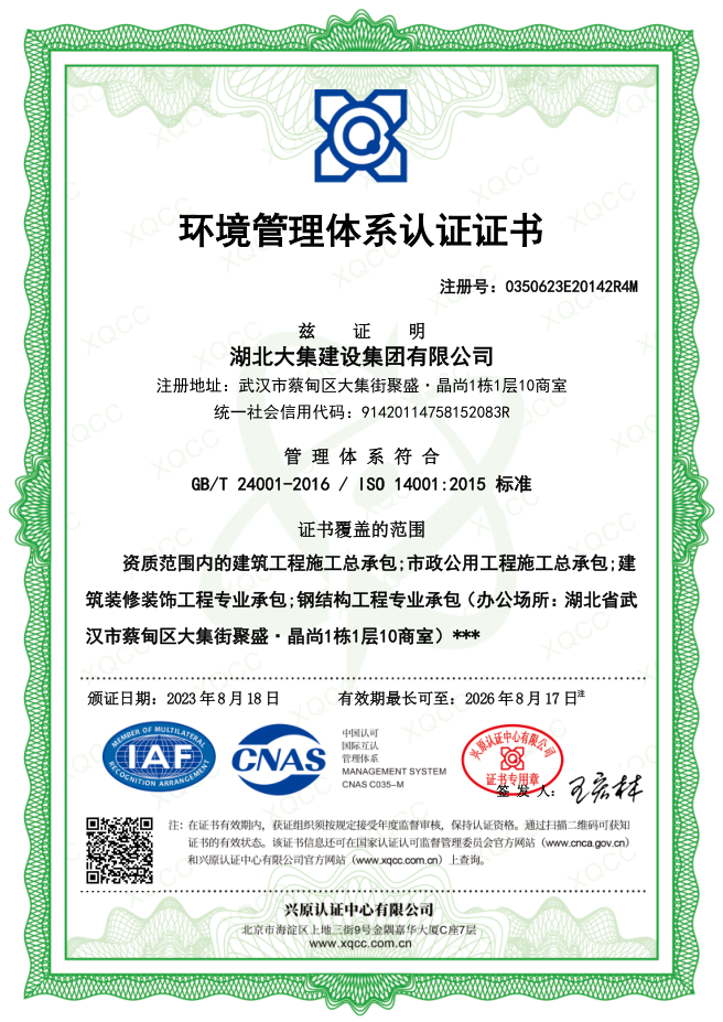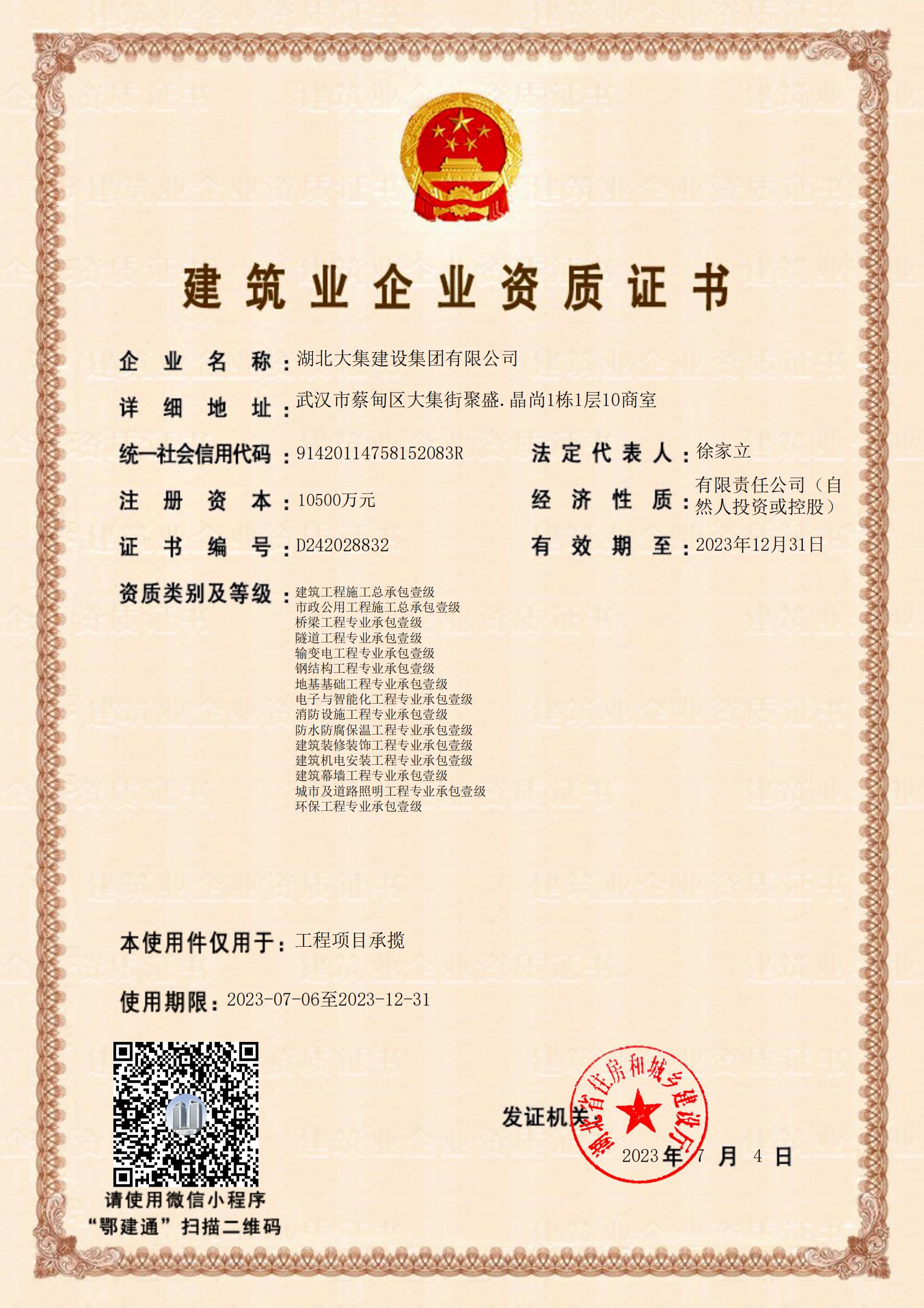 湖北大集建設集團有限公司成立于1990年,注冊資本10500萬元,是武漢市蔡甸區(qū)本土建筑行業(yè)的龍頭企業(yè),在行業(yè)內(nèi)具有一定的品牌影響力。擁有建筑工程施工總承包一級、市政公用工程施工總承包一級、橋梁工程專業(yè)承包一級、隧道工程專業(yè)承包一級、輸變電工程專業(yè)承包一級、鋼結構工程專業(yè)承包一級、地基基礎工程專業(yè)承包一級、電子與智能化工程專業(yè)承包一級、建筑裝修裝飾工程專業(yè)承包一級等多項資質(zhì)?,F(xiàn)已形成“建筑施工、園林綠化、文化旅游、房地產(chǎn)開發(fā)與物業(yè)管理”四大產(chǎn)業(yè)格局,并通過了行業(yè)和國家質(zhì)量管理體系、環(huán)境管理體系和職業(yè)健康安全管理體系認證,三大安全管理體系日臻完善,是一家綜合力較強的綜合性建筑施工企業(yè)。