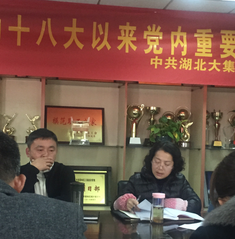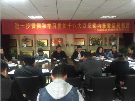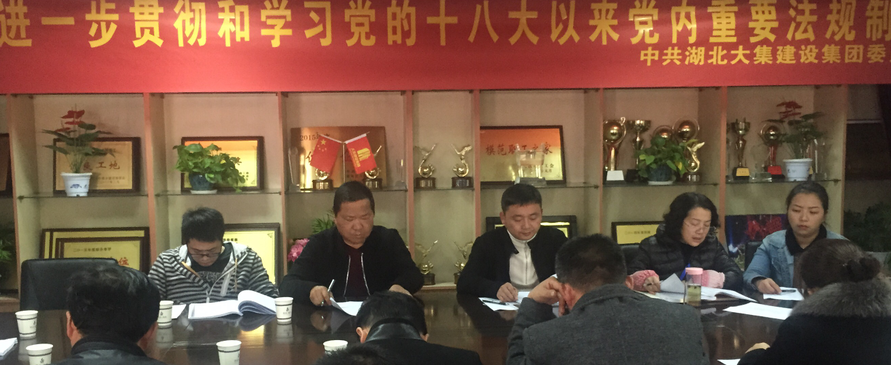 為了深入貫徹落實黨的十八屆六中全會精神,增加思想政治教育,加強(qiáng)黨的知識普及,2016年11月21日下午,湖北大集建設(shè)集團(tuán)黨委組織全體黨員同志在集團(tuán)會議室集中學(xué)習(xí)《中國共產(chǎn)黨章程》、《中國共產(chǎn)黨廉潔自律準(zhǔn)則》、《關(guān)于新形勢下黨內(nèi)政治生活的若干準(zhǔn)則》、《中國共產(chǎn)黨紀(jì)律處分條例》等黨內(nèi)文件和重要法規(guī)制度。
