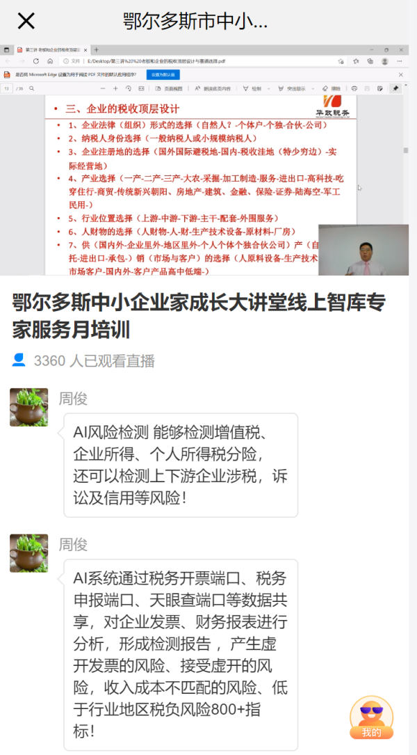 3月3日下午,由鄂爾多斯市中小企業(yè)公共服務(wù)平臺智庫專家、北京華政稅務(wù)高級合伙人、內(nèi)蒙古華政稅務(wù)總經(jīng)理、中國注冊會計師、中國注冊稅務(wù)師李愛軍為大家進行直播課程第三講,主題為“企業(yè)和老板的稅收頂層設(shè)計與賽道選擇”。課程從稅收頂層設(shè)計與賽道選擇、老板(投資者)個人的稅收頂層設(shè)計、企業(yè)的稅收頂層設(shè)計三個方面進行了詳細(xì)的講解,分享了如何運用系統(tǒng)論的方法,從國家現(xiàn)有稅收法律法規(guī)、行政規(guī)章全局的角度,對投資人的經(jīng)營活動、投資活動進行的全方位、各方面、各層次、各要素進行統(tǒng)籌規(guī)劃,以集中有效資源,高效快捷地實現(xiàn)企業(yè)利益最大化、企業(yè)價值的最大化,同時講解到“選擇比努力更重要,賽道選好事半功倍”。
