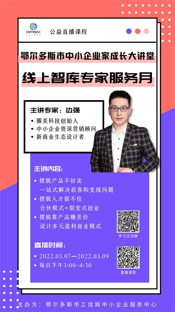你是否還在為流量小而苦惱?是否還在為找不到得力的員工而憂慮?是否還在為盈利點低而困惑?3月7日,鄂爾多斯市中小企業(yè)家成長大講堂線上智庫專家服務月培訓將為您帶來精彩營銷課程。3場直播,打通爆品海量引流,裂變式合伙創(chuàng)業(yè),社群營銷模式。本次課程我們邀請到鄂爾多斯市中小企業(yè)公共服務平臺智庫專家、圈美科技創(chuàng)始人、中小企業(yè)資深營銷顧問、新商業(yè)生態(tài)設計者邊強為大家直播授課。
