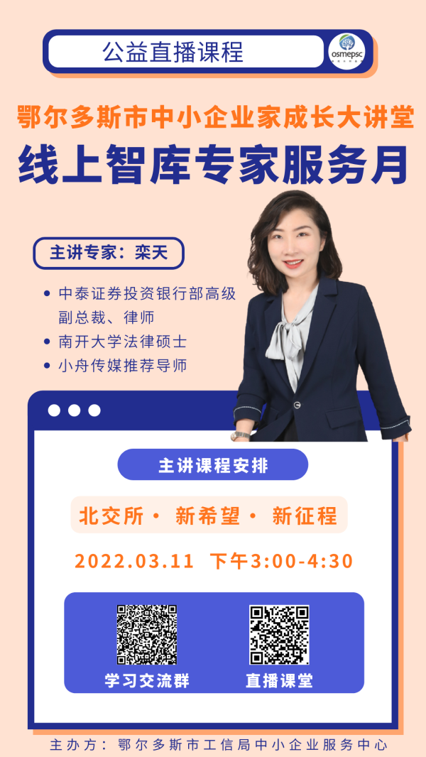 為助力我市中小微企業(yè)搶抓新三板契機,了解新三板的運行規(guī)則,掌握掛牌融資和股份轉(zhuǎn)讓的操作實務(wù),更快更早的參與到資本市場的培育和競爭中來,促進我市中小微企業(yè)健康快速發(fā)展。2022年3月11日,鄂爾多斯市中小企業(yè)家成長大講堂線上智庫專家服務(wù)月培訓(xùn)將為您帶來“走進新三板 迎接新機遇”主題培訓(xùn)。本次課程我們邀請到鄂爾多斯市中小企業(yè)公共服務(wù)平臺智庫專家、中泰證券投資銀行部高級副總裁欒天為大家直播授課。