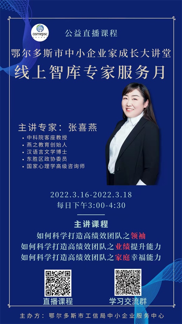 團隊管理是現(xiàn)代企業(yè)管理的核心,為全面提升我市中小微企業(yè)管理者的團隊建設與管理能力,充分掌握高績效團隊管理的方法和技巧,帶領企業(yè)快速適應市場環(huán)境變化,為企業(yè)高質量發(fā)展奠定堅實的基石,2022年3月16日,鄂爾多斯市中小企業(yè)家成長大講堂線上智庫專家服務培訓將為您帶來精彩直播課程——如何打造高績效團隊之領袖。本次課程我們邀請到鄂爾多斯市中小企業(yè)公共服務平臺智庫專家、內蒙古燕之教育集團董事長、漢語言文學博士、國家心理學高級咨詢師張喜燕為大家直播授課。