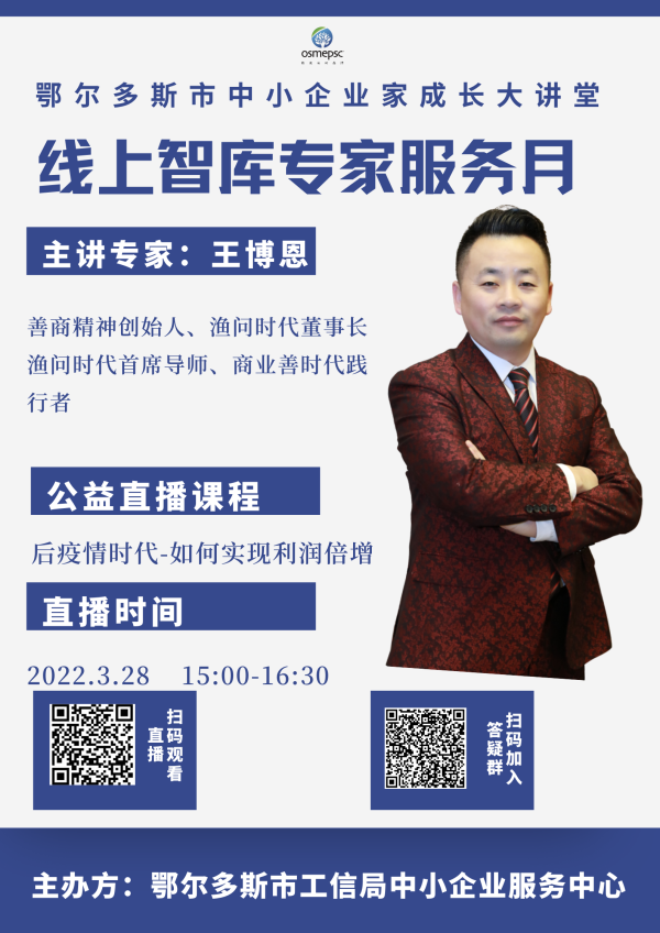 本次課程我們邀請到鄂爾多斯市中小企業(yè)公共服務平臺智庫專家、漁問時代(大連)科技股份有限公司董事長王博恩為大家直播授課。