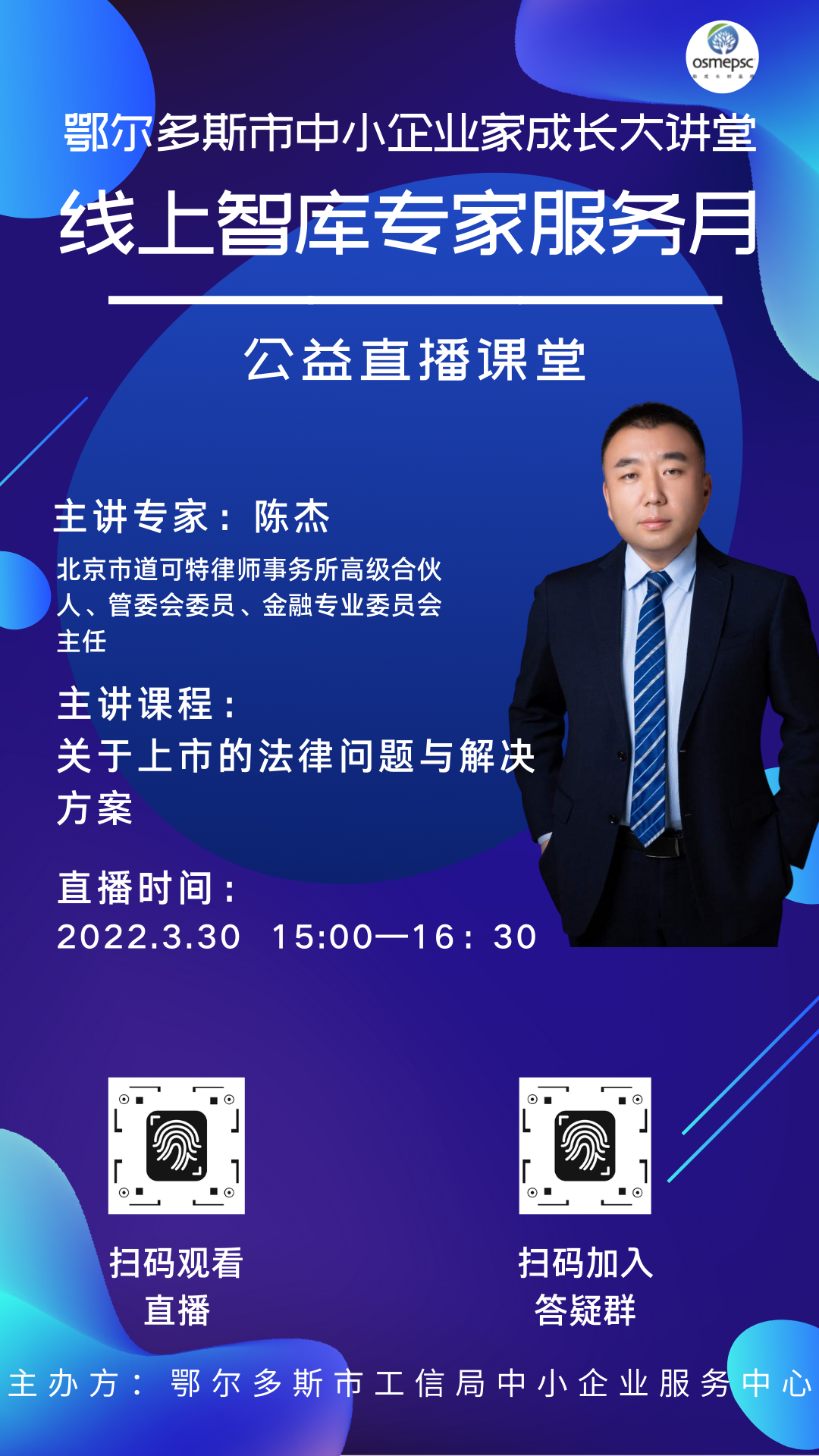 為幫助中小企業(yè)進一步了解上市相關(guān)的法律問題,在規(guī)范的法律框架下籌備上市工作,3月30日,鄂爾多斯市中小企業(yè)家成長大講堂線上智庫專家服務(wù)月培訓(xùn)將為您帶來精彩直播課程——關(guān)于上市的法律問題與解決方案。本次課程我們邀請到鄂爾多斯市中小企業(yè)公共服務(wù)平臺智庫專家、北京市道可特律師事務(wù)所高級合伙人陳杰為大家直播授課。