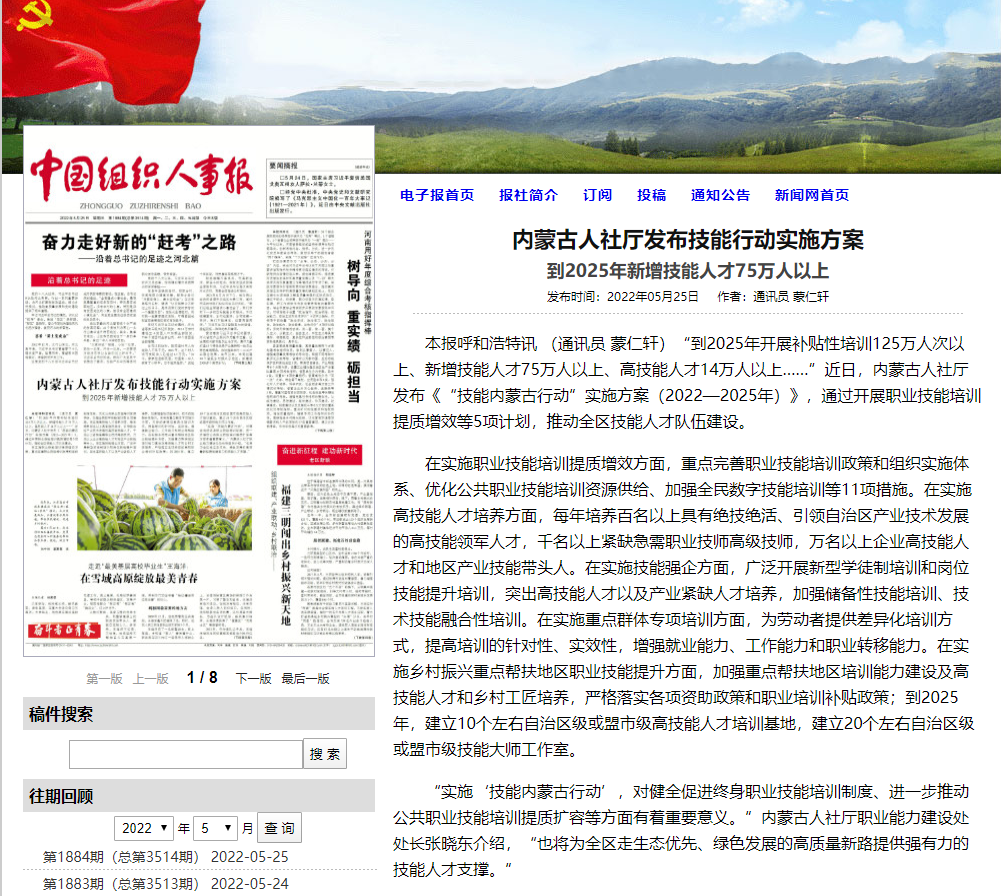 《“技能內(nèi)蒙古行動”實施方案(2022-2025年)》發(fā)布后,受到社會各界廣泛關(guān)注。5月25日,《中國組織人事報》頭版刊了發(fā)題為《內(nèi)蒙古人社廳發(fā)布技能行動實施方案 到2025年新增技能人才75萬人以上》的通訊員文章。