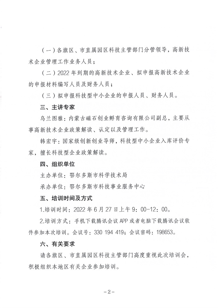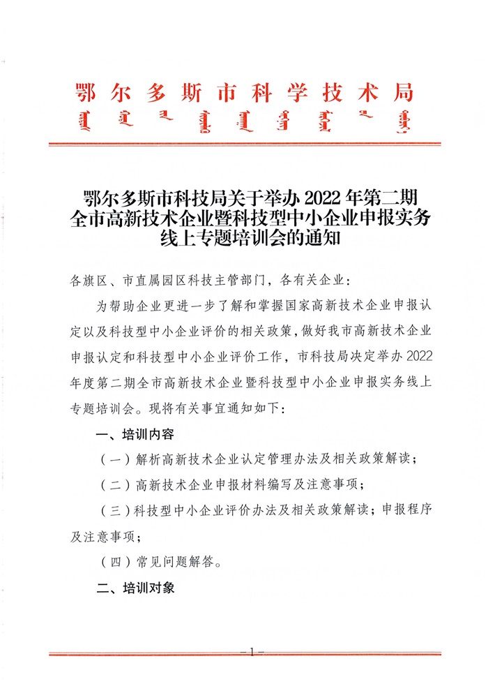 鄂爾多斯市科技局關于舉辦2022年第二期全市高新技術企業(yè)暨科技型中小企業(yè)申報實務線上專題培訓會的通知