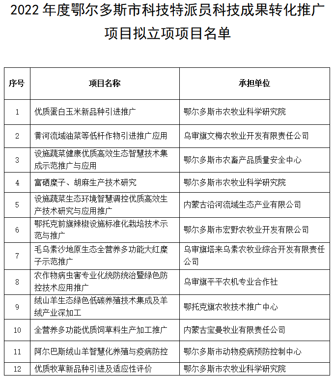 附件:2022年度鄂爾多斯市科技特派員科技成果轉(zhuǎn)化推廣項(xiàng)目擬立項(xiàng)項(xiàng)目名單