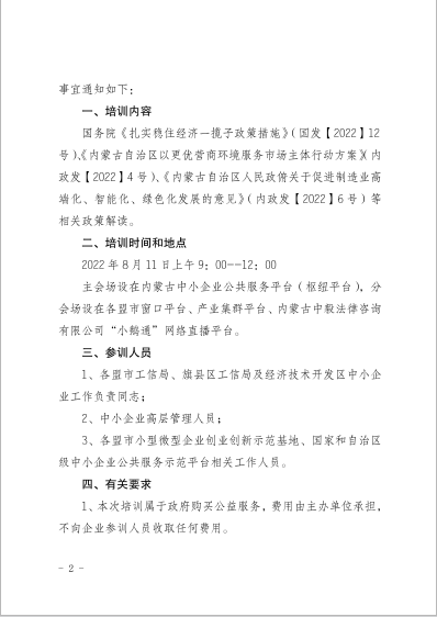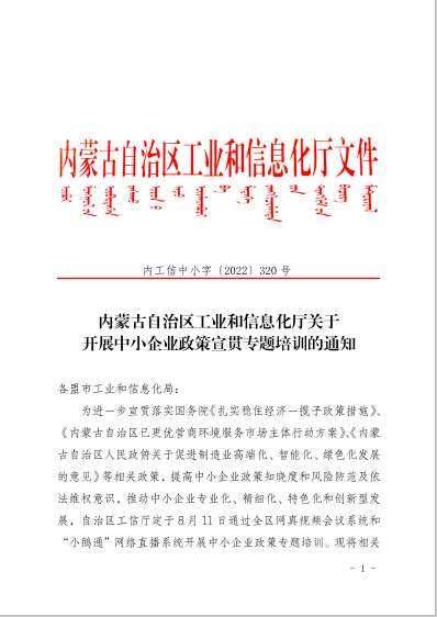 內(nèi)蒙古自治區(qū)工業(yè)和信息化廳關(guān)于開展中小企業(yè)政策宣貫專題培訓(xùn)的通知