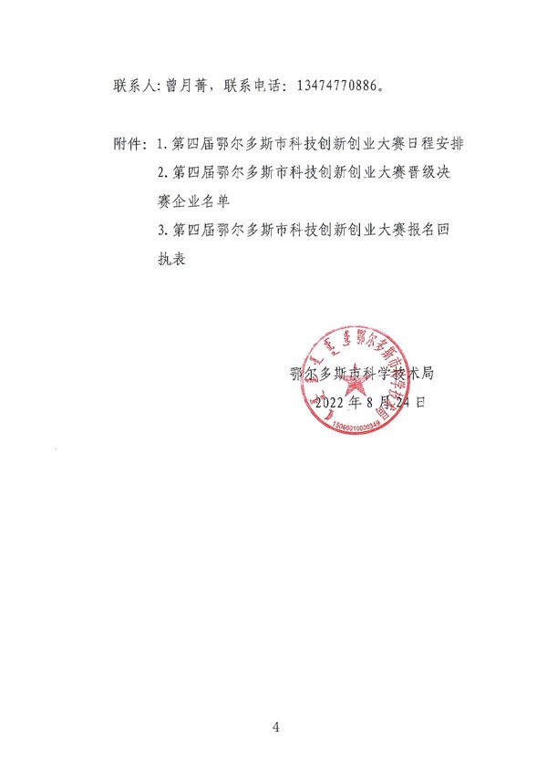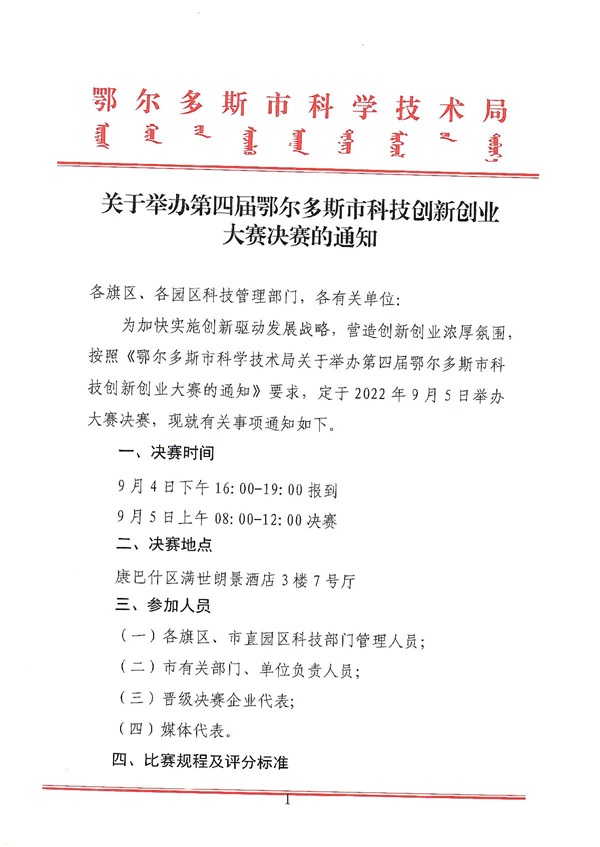 關于舉辦第四屆鄂爾多斯市科技創(chuàng)新創(chuàng)業(yè)大賽決賽的通知