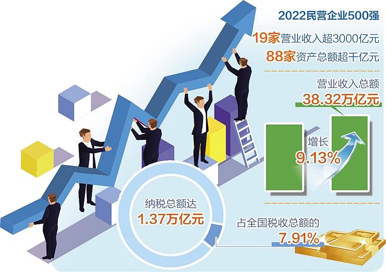 數(shù)據(jù)顯示,民營企業(yè)500強(qiáng)營業(yè)收入總額38.32萬億元,增長9.13%。