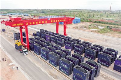 作為煤炭供給端的鄂爾多斯市東勝區(qū)萬利陸港,物流設備標準化讓“甩箱”技術實現(xiàn)多式聯(lián)運“一單到底”,煤炭集裝箱空重換裝降至2分鐘,每年可裝卸約12萬標箱約360萬噸。同時,煤礦生產的原煤,未來將隨光伏驅動的氣懸浮傳送帶,沿著約4.7公里的輸煤線路進入輸煤塔,全程無粉塵,輸煤塔內的煤塊進入一個個集裝箱,在高達幾十米的龍門吊操作下,由一輛輛新能源重卡拉走。