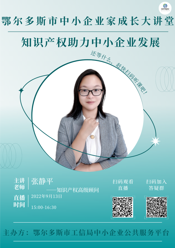創(chuàng)新已成為中小企業(yè)快速成長(zhǎng)的原動(dòng)力,是提升核心競(jìng)爭(zhēng)力和持續(xù)發(fā)展能力的關(guān)鍵抓手。保護(hù)知識(shí)產(chǎn)權(quán)就是保護(hù)創(chuàng)新,用好知識(shí)產(chǎn)權(quán)才能激勵(lì)創(chuàng)新。為充分發(fā)揮知識(shí)產(chǎn)權(quán)管理在中小企業(yè)發(fā)展中的重要作用,進(jìn)一步增強(qiáng)中小企業(yè)知識(shí)產(chǎn)權(quán)保護(hù)意識(shí)和管理水平,助力企業(yè)創(chuàng)新高質(zhì)量發(fā)展,2022年9月13日,鄂爾多斯市中小企業(yè)家成長(zhǎng)大講堂將為您帶來精彩直播課程——知識(shí)產(chǎn)權(quán)助力中小企業(yè)發(fā)展。本次課程我們邀請(qǐng)到知識(shí)產(chǎn)權(quán)高級(jí)顧問張靜平為大家直播授課。