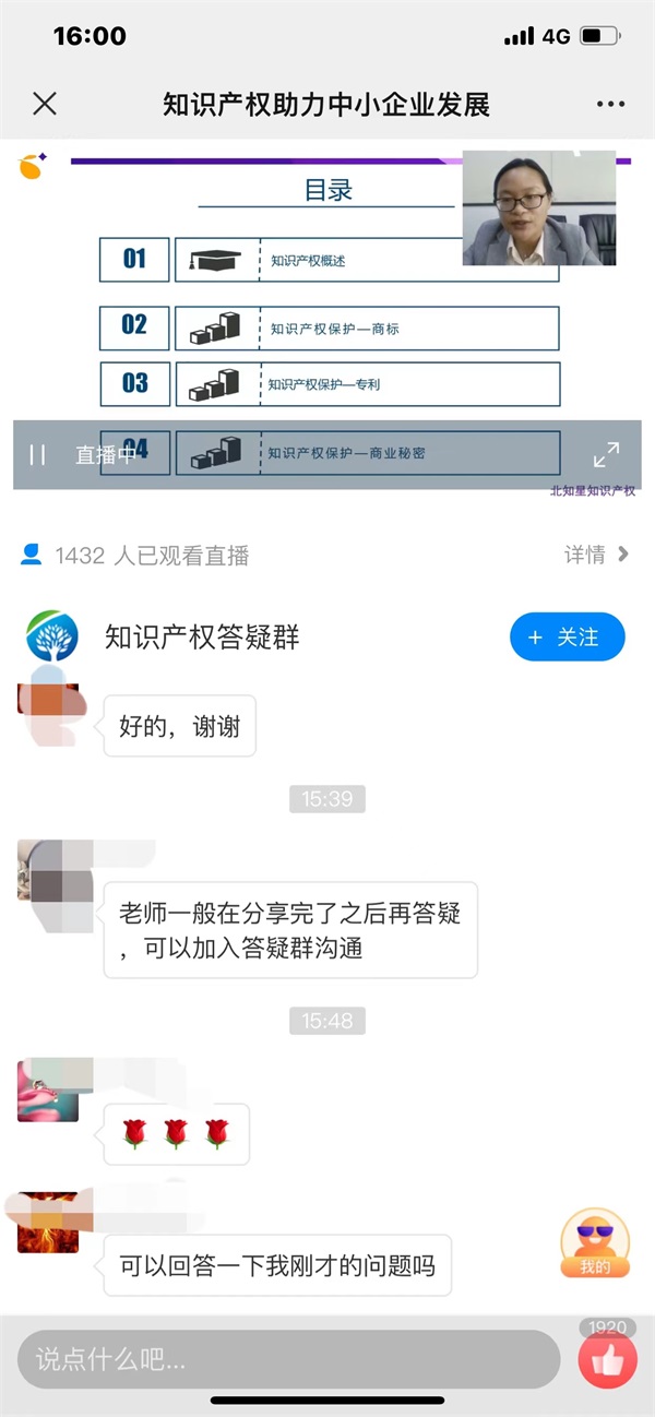 張靜平重點(diǎn)以知識(shí)產(chǎn)權(quán)對(duì)于企業(yè)發(fā)展的意義為切入點(diǎn),通過大量的經(jīng)典案例分析,結(jié)合自身豐富的工作經(jīng)驗(yàn),從知識(shí)產(chǎn)權(quán)概述、如何做好知識(shí)產(chǎn)權(quán)保護(hù)等角度進(jìn)行了全面的講解和剖析,幫助企業(yè)樹立知識(shí)產(chǎn)權(quán)保護(hù)意識(shí),掌握知識(shí)產(chǎn)權(quán)在創(chuàng)造、運(yùn)用、服務(wù)、管理過程中的關(guān)鍵要素,確保其所學(xué)能直接用于實(shí)際工作中。培訓(xùn)最后,培訓(xùn)老師在線上與參訓(xùn)人員互動(dòng)交流,對(duì)企業(yè)提出的商標(biāo)注冊(cè)、知識(shí)產(chǎn)權(quán)變現(xiàn)等方面實(shí)際問題進(jìn)行了詳細(xì)解答。
