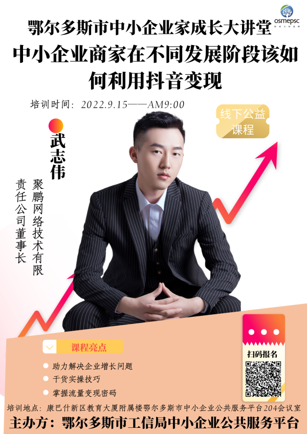 為幫助中小企業(yè)在“流量”新趨勢(shì)下進(jìn)一步了解抖音短視頻的變現(xiàn)方法,掌握線下線上引流技巧,降低企業(yè)獲客成本,提高訂單量,助力企業(yè)健康發(fā)展。鄂爾多斯市中小企業(yè)公共服務(wù)平臺(tái)攜手平臺(tái)入駐服務(wù)機(jī)構(gòu)鄂爾多斯市聚鵬網(wǎng)絡(luò)技術(shù)有限責(zé)任公司開(kāi)展“中小企業(yè)商家在不同的發(fā)展階段該如何利用抖音變現(xiàn)”培訓(xùn)課程。歡迎廣大中小企業(yè)家積極參加!