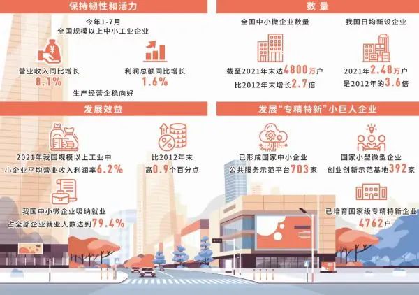 量大面廣的中小企業(yè)是穩(wěn)經(jīng)濟(jì)穩(wěn)就業(yè)的重要力量。黨的十八大以來,我國(guó)促進(jìn)中小企業(yè)發(fā)展的政策體系、服務(wù)體系不斷完善,發(fā)展環(huán)境不斷優(yōu)化,中小企業(yè)呈現(xiàn)又快又好的發(fā)展態(tài)勢(shì),對(duì)經(jīng)濟(jì)社會(huì)發(fā)展全局作出重要貢獻(xiàn)。截至2021年末,全國(guó)中小微企業(yè)數(shù)量達(dá)4800萬戶,比2012年末增長(zhǎng)2.7倍;2021年我國(guó)日均新設(shè)企業(yè)2.48萬戶,是2012年的3.6倍。2021年我國(guó)規(guī)模以上工業(yè)中小企業(yè)平均營(yíng)業(yè)收入利潤(rùn)率6.2%,比2012年末提高0.9個(gè)百分點(diǎn)。第四次全國(guó)經(jīng)濟(jì)普查顯示,我國(guó)中小微企業(yè)吸納就業(yè)占全部企業(yè)就業(yè)人數(shù)達(dá)到79.4%。