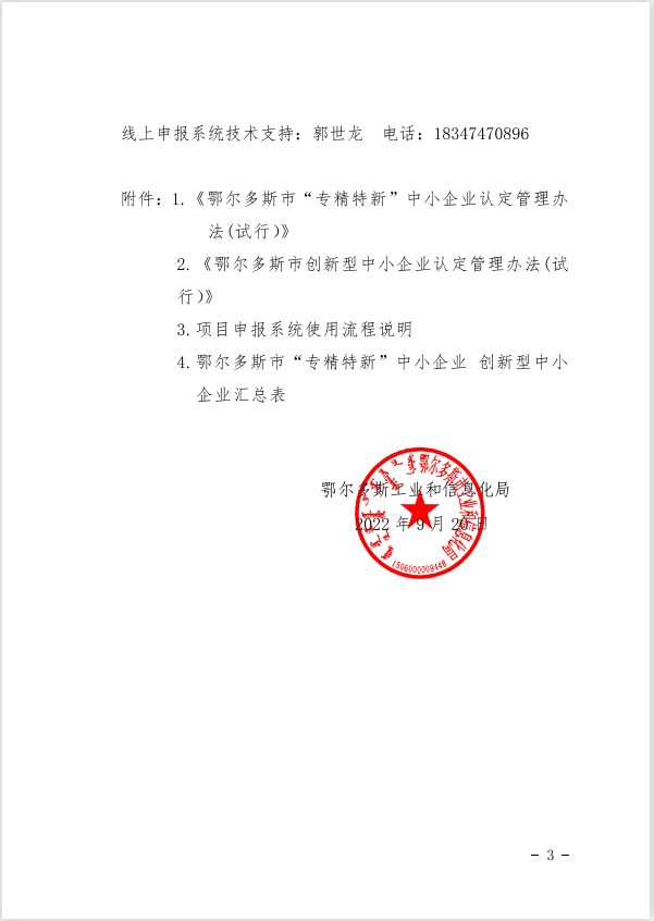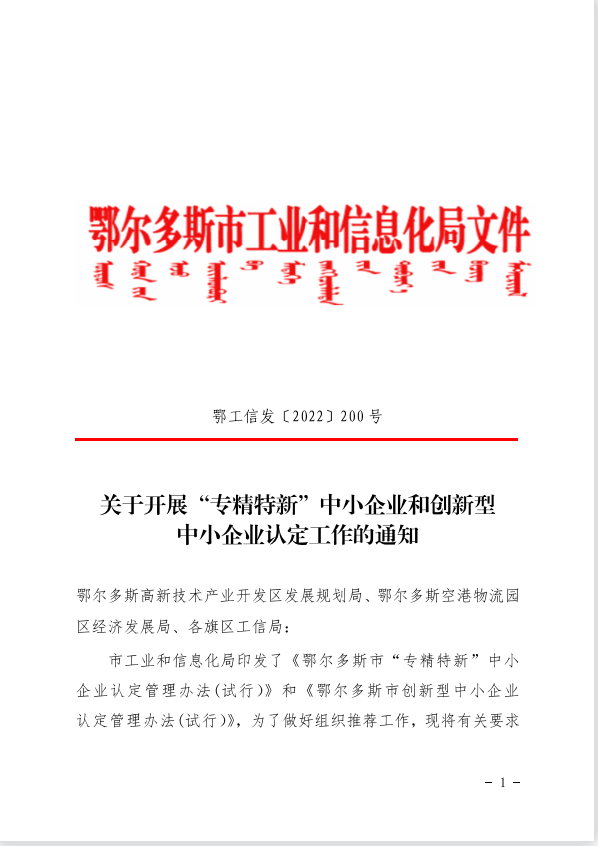 5.對經(jīng)公示無異議的企業(yè),市工業(yè)和信息化局發(fā)文公布創(chuàng)新型中小企業(yè)名單,并按程序授予鄂爾多斯市創(chuàng)新型中小企業(yè)稱號,同時享受相關(guān)的獎勵政策。