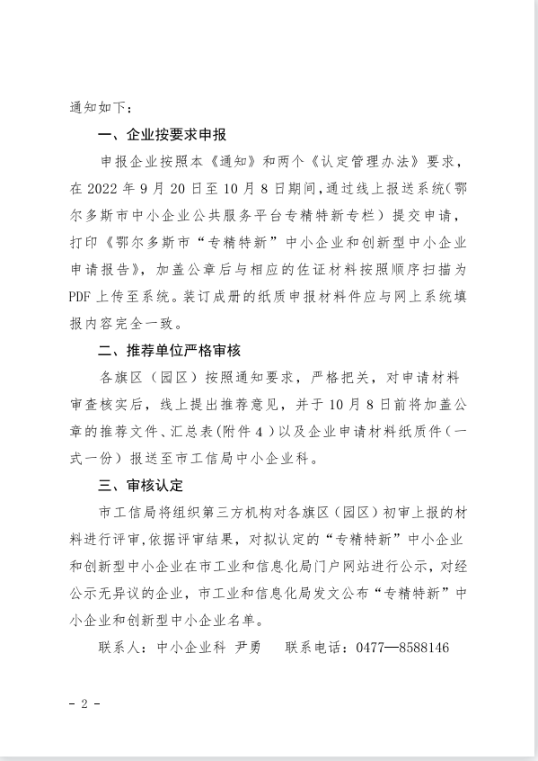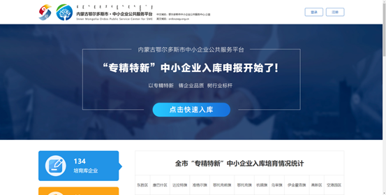 (二)申報入庫。申報企業(yè)通過鄂爾多斯市中小企業(yè)公共服務(wù)平臺在線填報資料申請進(jìn)入“專精特新”中小企業(yè)培育庫。符合入庫條件的申報企業(yè),審核通過后將其納入“專精特新”中小企業(yè)培育庫。