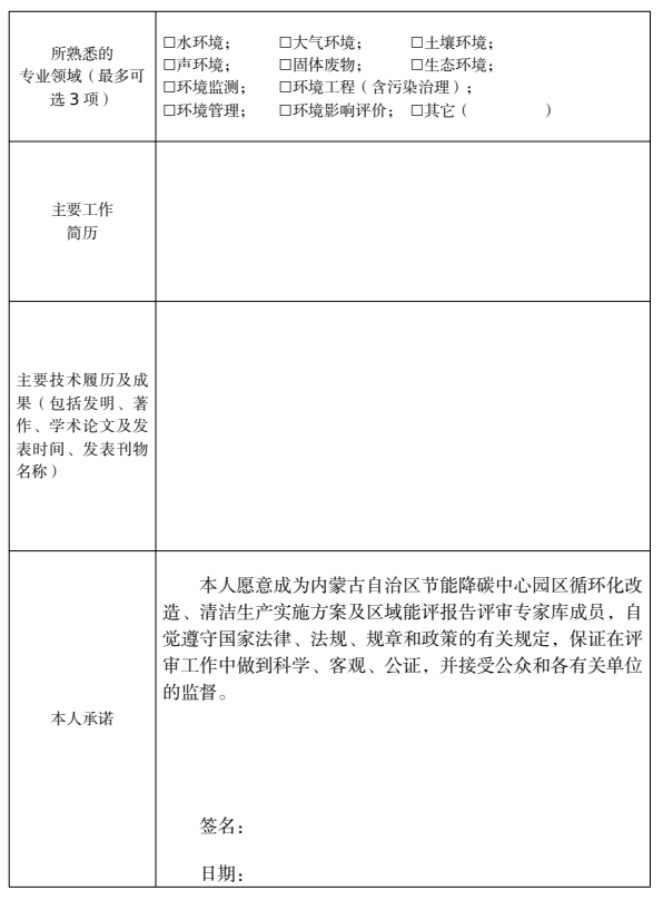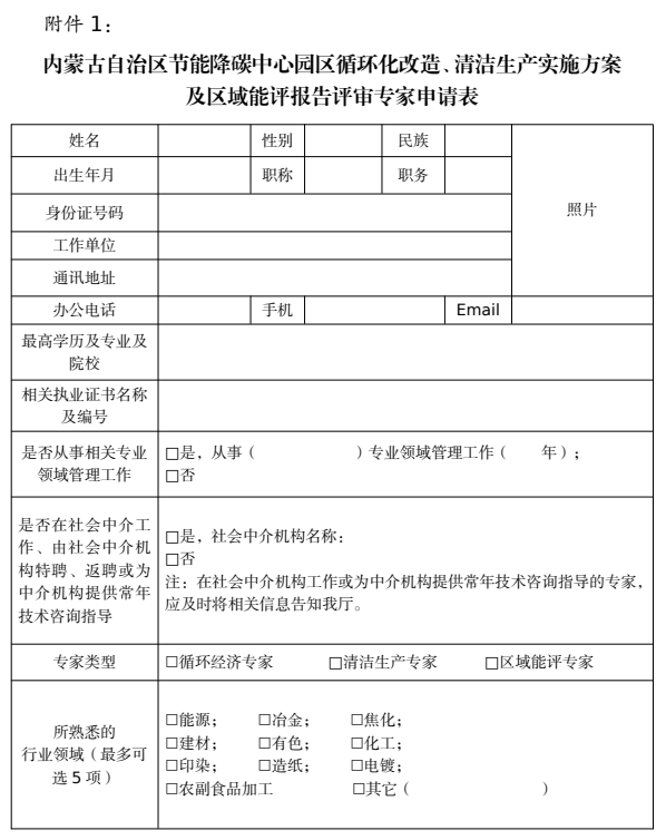 附件:1.《內蒙古自治區(qū)節(jié)能降碳中心園區(qū)循環(huán)化改造、清潔生產實施方案及區(qū)域能評報告評審專家申請表》