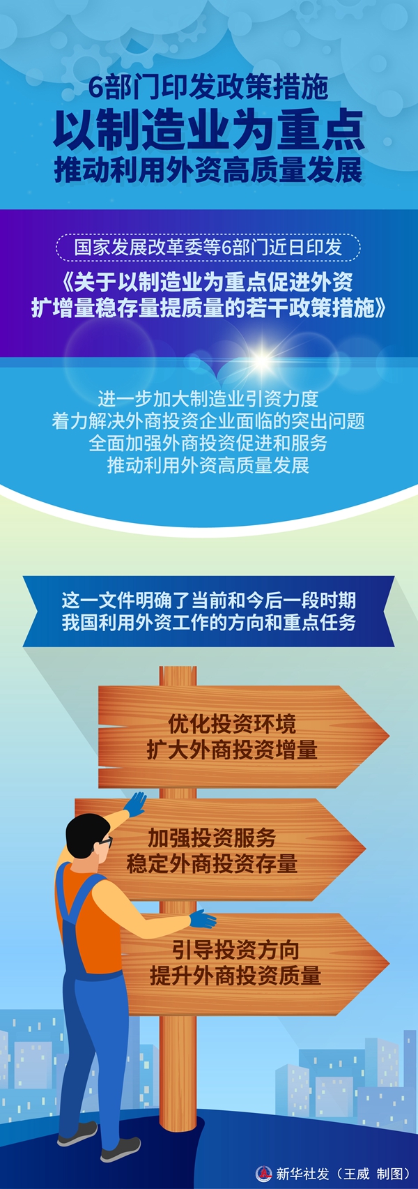 記者25日了解到,國家發(fā)展改革委等6部門近日印發(fā)《關(guān)于以制造業(yè)為重點促進(jìn)外資擴(kuò)增量穩(wěn)存量提質(zhì)量的若干政策措施》,進(jìn)一步加大制造業(yè)引資力度,著力解決外商投資企業(yè)面臨的突出問題,全面加強(qiáng)外商投資促進(jìn)和服務(wù),推動利用外資高質(zhì)量發(fā)展。