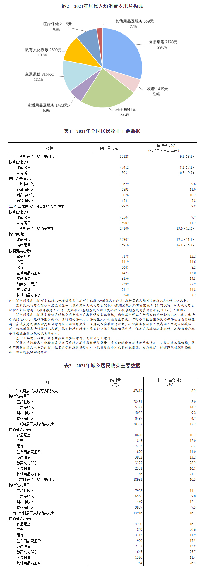 2021年,全國居民人均食品煙酒消費支出7178元,增長12.2%,占人均消費支出的比重為29.8%;人均衣著消費支出1419元,增長14.6%,占人均消費支出的比重為5.9%;人均居住消費支出5641元,增長8.2%,占人均消費支出的比重為23.4%;人均生活用品及服務消費支出1423元,增長13.0%,占人均消費支出的比重為5.9%;人均交通通信消費支出3156元,增長14.3%,占人均消費支出的比重為13.1%;人均教育文化娛樂消費支出2599元,增長27.9%,占人均消費支出的比重為10.8%;人均醫(yī)療保健消費支出2115元,增長14.8%,占人均消費支出的比重為8.8%;人均其他用品及服務消費支出569元,增長23.2%,占人均消費支出的比重為2.4%。