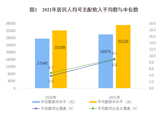 2021年,全國居民人均可支配收入中位數29975元,增長8.8%,中位數是平均數的85.3%。其中,城鎮(zhèn)居民人均可支配收入中位數43504元,增長7.7%,中位數是平均數的91.8%;農村居民人均可支配收入中位數16902元,增長11.2%,中位數是平均數的89.3%。