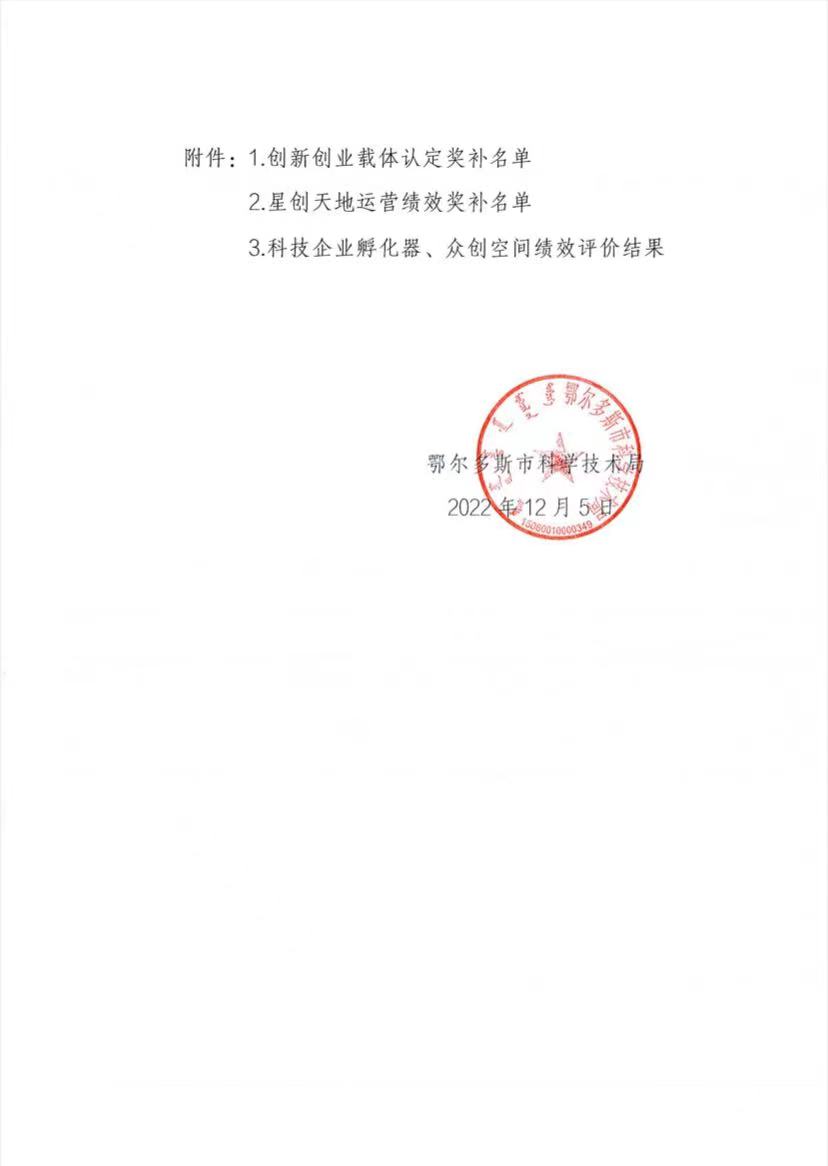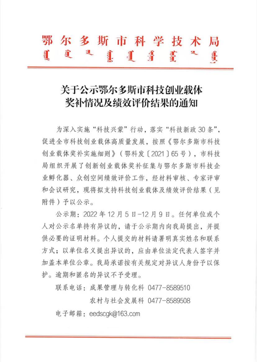 關(guān)于公示鄂爾多斯市科技創(chuàng)業(yè)載體獎補情況及績效評價結(jié)果的通知