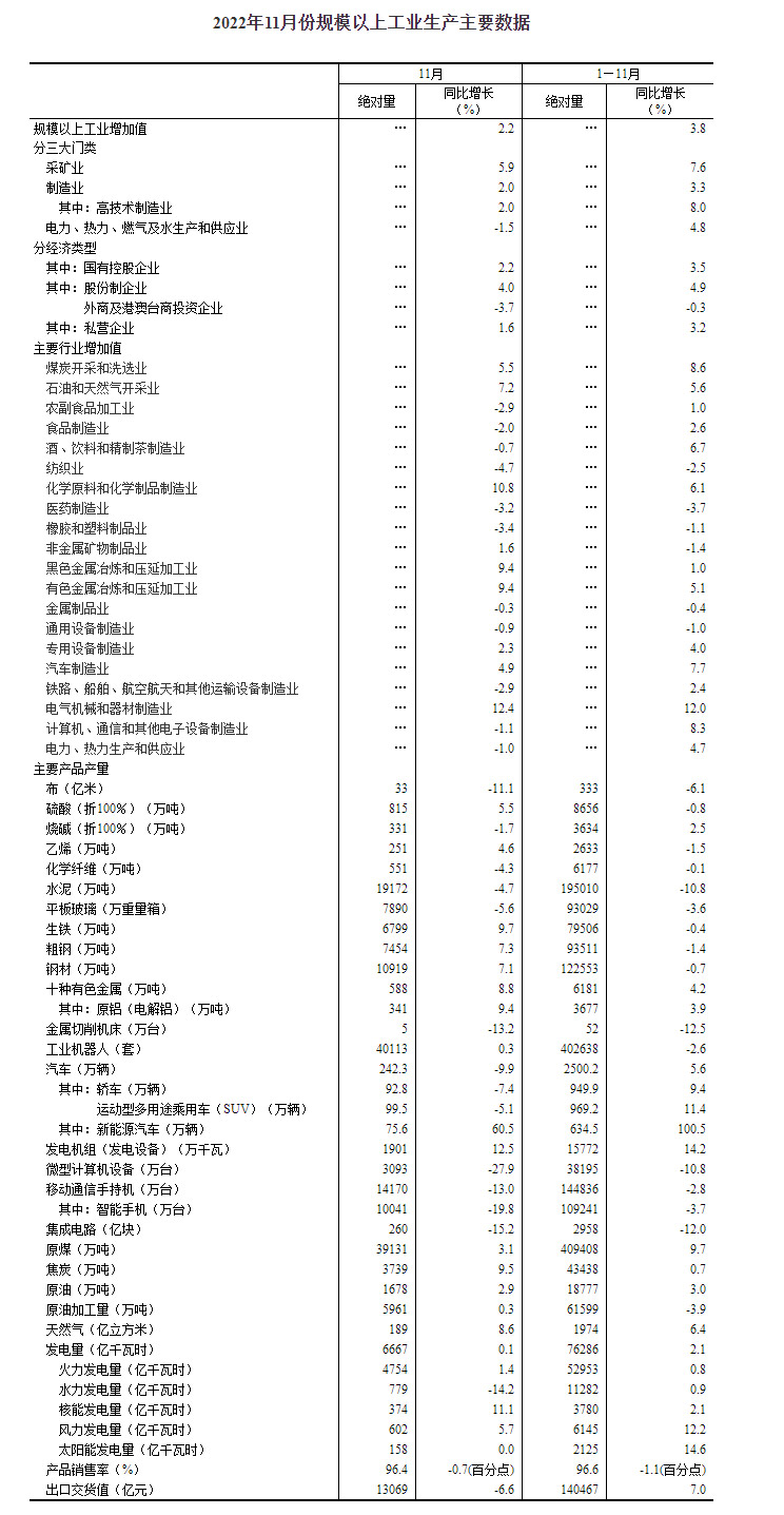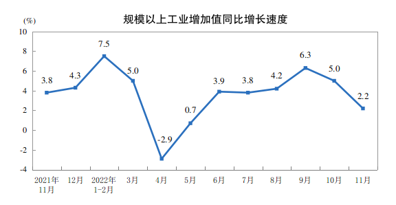 11月份,規(guī)模以上工業(yè)增加值同比實(shí)際增長(zhǎng)2.2%(增加值增速均為扣除價(jià)格因素的實(shí)際增長(zhǎng)率)。從環(huán)比看,11月份,規(guī)模以上工業(yè)增加值比上月下降0.31%。1—11月份,規(guī)模以上工業(yè)增加值同比增長(zhǎng)3.8%。