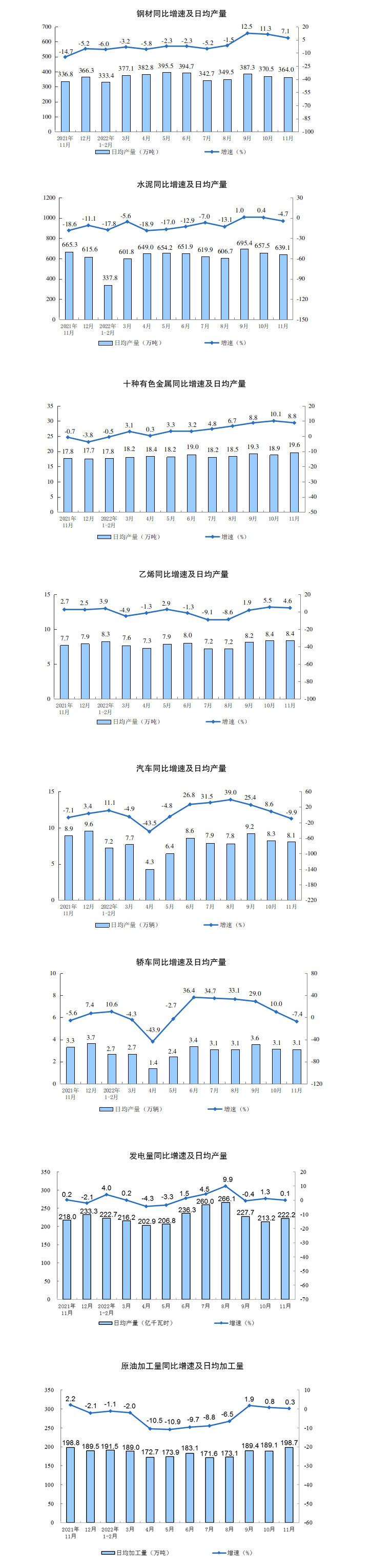 分產(chǎn)品看,11月份,617種產(chǎn)品中有227種產(chǎn)品產(chǎn)量同比增長(zhǎng)。鋼材10919萬噸,同比增長(zhǎng)7.1%;水泥19172萬噸,下降4.7%;十種有色金屬588萬噸,增長(zhǎng)8.8%;乙烯251萬噸,增長(zhǎng)4.6%;汽車242.3萬輛,下降9.9%,其中新能源汽車75.6萬輛,增長(zhǎng)60.5%;發(fā)電量6667億千瓦時(shí),增長(zhǎng)0.1%;原油加工量5961萬噸,增長(zhǎng)0.3%。