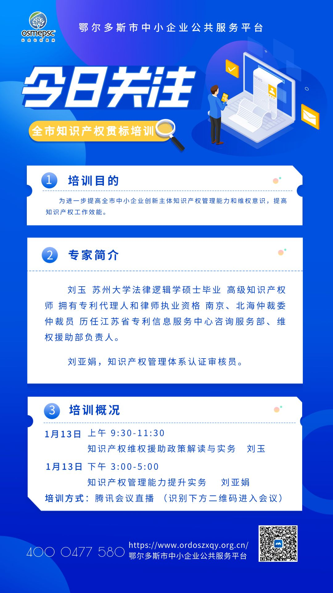 為貫徹落實市委、市政府知識產權強市決策部署,進一步提高創(chuàng)新主體知識產權管理能力和維權意識,提高全市知識產權工作效能,充分發(fā)揮知識產權管理在中小企業(yè)發(fā)展中的重要作用,助力中小企業(yè)創(chuàng)新高質量發(fā)展。鄂爾多斯市中小企業(yè)公共服務平臺特邀全市中小企業(yè)企業(yè)參加鄂爾多斯市市場監(jiān)督管理局(知識產權局)主辦的全市知識產權貫標培訓。