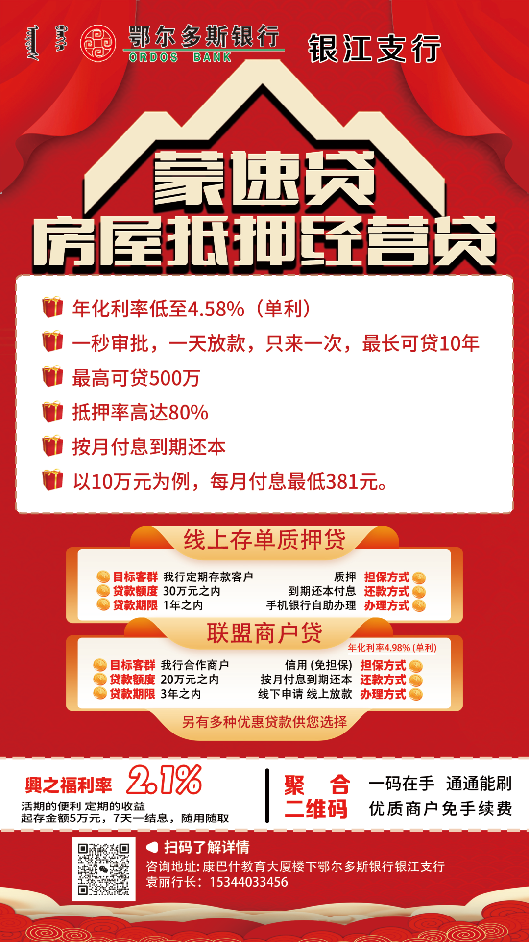 現(xiàn)鄂爾多斯銀行特推出“蒙速貸—房屋抵押經(jīng)營貸”助推中小企業(yè)高質(zhì)量發(fā)展。↓↓↓