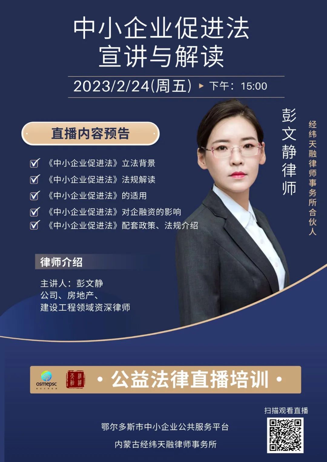 2023年是《中華人民共和國中小企業(yè)促進法》(以下簡稱中小企業(yè)促進法)正式實施20周年和修訂實施5周年,為更好地貫徹落實《中小企業(yè)促進法》,促進中小企業(yè)創(chuàng)新發(fā)展,推進《中小企業(yè)促進法》的宣貫,全面提升全市中小企業(yè)政策運用能力、創(chuàng)業(yè)創(chuàng)新能力和經營管理水平,鄂爾多斯市中小企業(yè)公共服務平臺特邀請鄂爾多斯市中小企業(yè)法治體檢站-內蒙古經緯天融律師事務所,為提高鄂爾多斯市中小企業(yè)掌握政策、運用政策、享受政策的能力,舉辦《中小企業(yè)促進法宣講與解讀》公益培訓活動。
