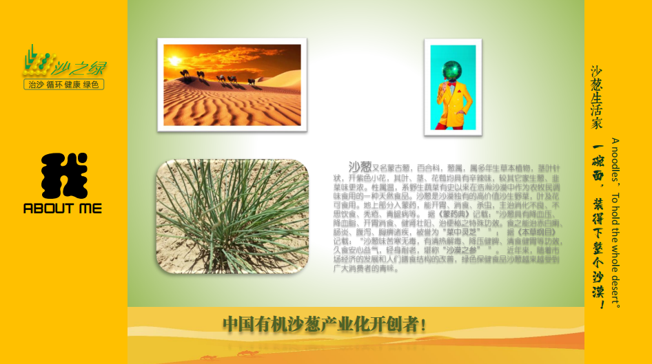鄂爾多斯市有機食品有限公司坐落于達拉特旗展旦召蘇木王馬駒五社,現(xiàn)擁有土地882畝。累計投資2000萬元,建成加工車間400平方米,保鮮庫100平方米,包裝材料庫200平方米,成品庫100平方米,輔助車間200平方米,引進水浸沙蔥半自動生產(chǎn)線1條(包括清洗、烘干、脫水、脫鹽、切段、混料、灌裝等設備),同時配有掛面生產(chǎn)線1條,餅干生產(chǎn)線1條,沙蔥醬生產(chǎn)線1條 。正常運行,年標準化精細深加工沙蔥500噸,2014年8月沙蔥產(chǎn)品取得有機認證,2015年6月有機沙蔥上市銷售。合作社現(xiàn)有職21工人,其中技術員9名,其中貧困農(nóng)戶職工7人。公司已注冊沙之綠、漠之青、沙之美、沙之夢、蒙韭沙莊、媽鄉(xiāng)伴、沙漠男人、大法令、者別、建為、逍什等12個名稱及標志,共計40多個商標,相關包裝設計外觀專利保護9個,一個國家發(fā)明專利,另有三個專利正在申請中。