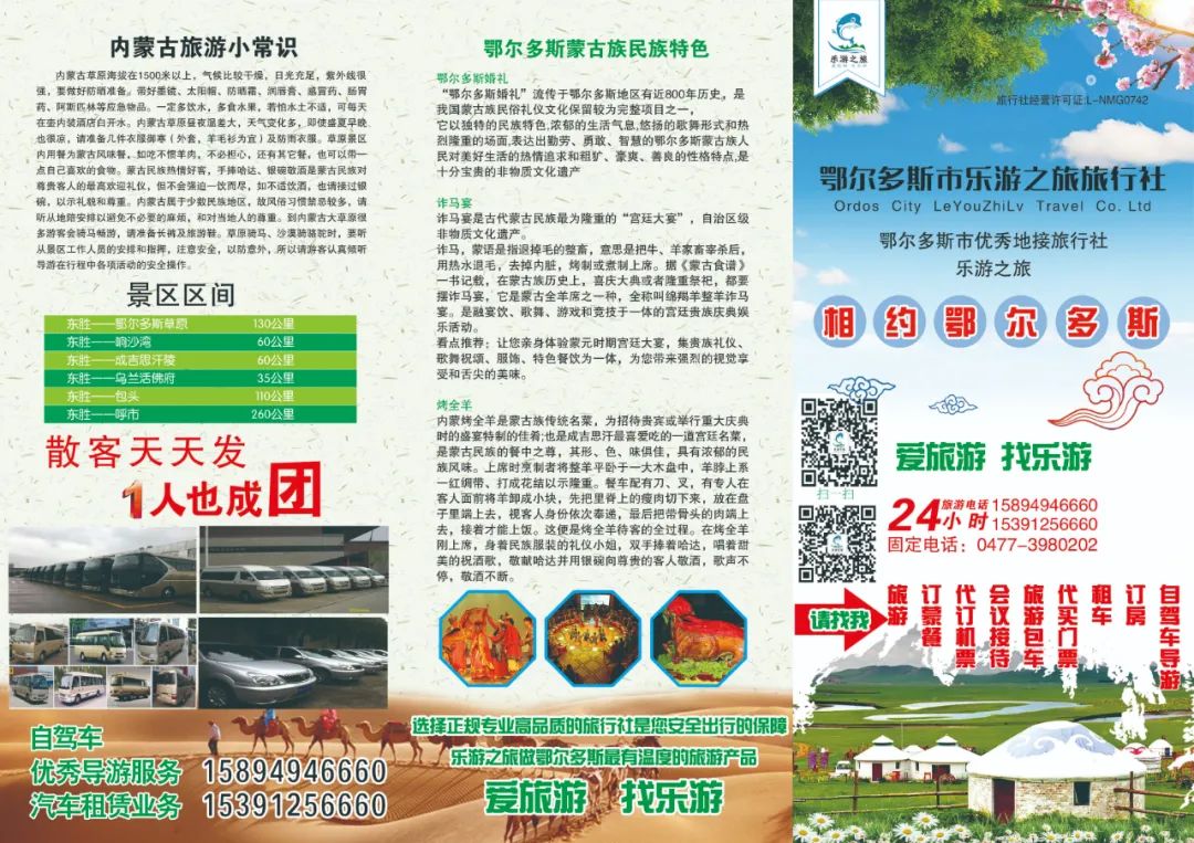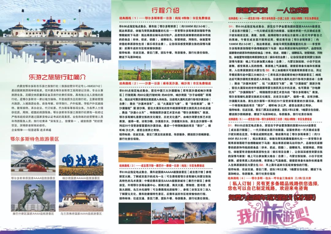 鄂爾多斯市樂游之旅旅行社經國家旅游局審核批準,在內蒙古鄂爾多斯市工商局登記注冊、專業(yè)從事旅游業(yè)務、足額交納質量保證金及旅行社責任保險、具有獨立法人資格的旅行社。2021年被評為鄂爾多斯市AAA級旅行社,2022年被評為內蒙古自治區(qū)AAAA級誠信旅行社,是鄂爾多斯市一家以地方接待、外發(fā)組團為主的旅行社,主要經營國內旅游、入境旅游業(yè)務、商務考察、研學旅行、戶外拓展、紅色培訓、學校戶外實踐接待、散客接待、承辦會議、代訂機票、代辦租車等各項業(yè)務,為各界人士提供優(yōu)質、周到、超值的旅游服務。鄂爾多斯市樂游之旅旅行社擁有一批經過嚴格系統(tǒng)培訓并通過國家資格認證考試的高素質、業(yè)務熟練的經營管理人員和導游服務人員;旅行社秉承“賓客至上、 信譽第一 、誠信旅游“的經營宗旨,深得新老顧客的信任。