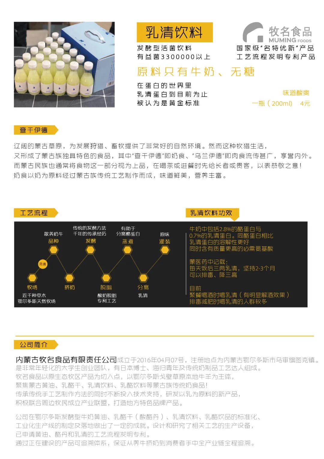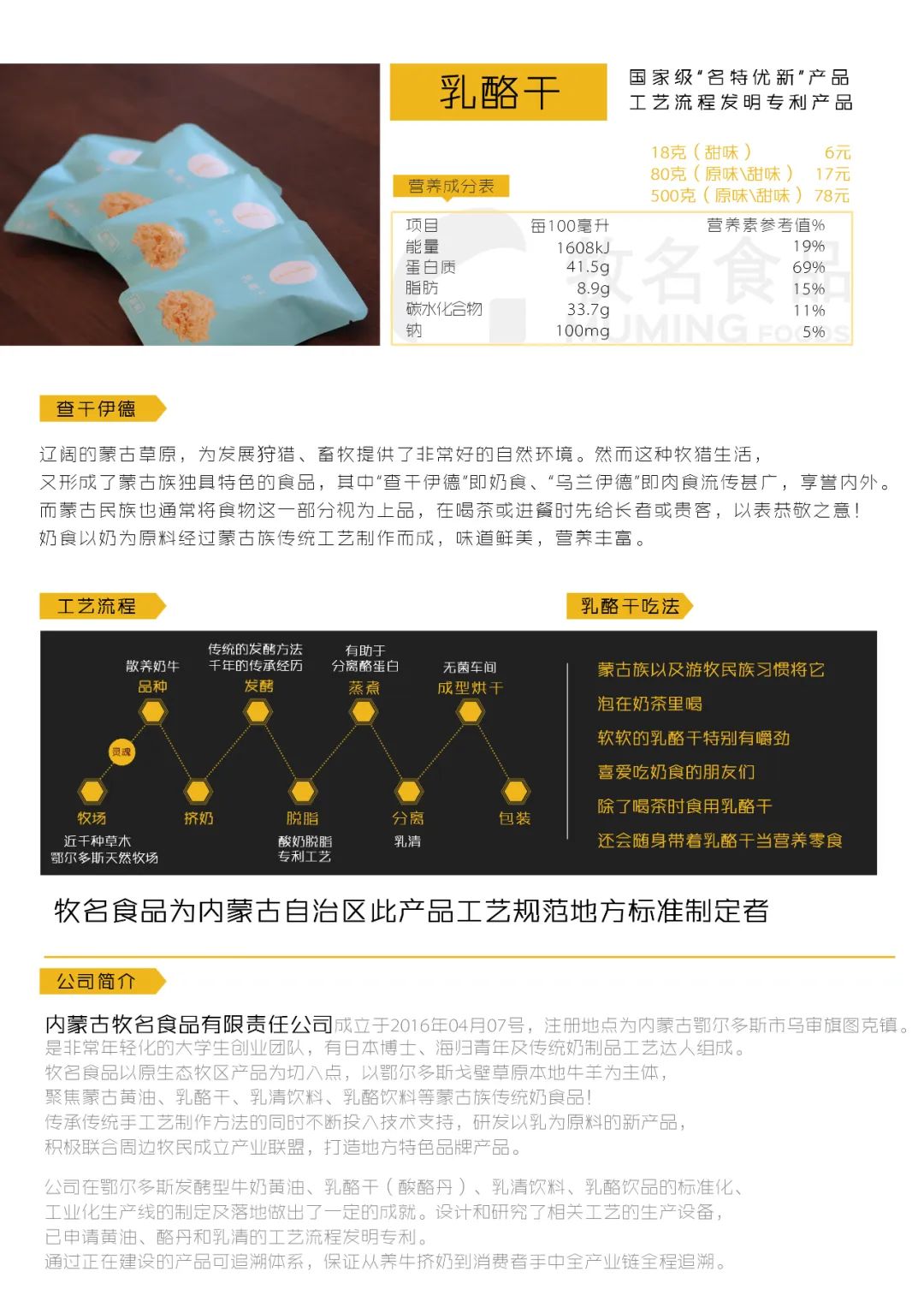 內(nèi)蒙古牧名食品有限責(zé)任公司成立于2016年04月07號(hào),注冊(cè)地點(diǎn)為內(nèi)蒙古鄂爾多斯市烏審旗圖克鎮(zhèn),是鄂爾多斯市農(nóng)牧業(yè)產(chǎn)業(yè)化龍頭企業(yè)。公司由日本博士、海歸青年及傳統(tǒng)奶制品工藝達(dá)人組成。牧名食品以原生態(tài)牧區(qū)產(chǎn)品為切入點(diǎn),以娟姍奶牛為主體,聚焦蒙古黃油、乳酪干、乳清飲料、乳酪飲料等蒙古族傳統(tǒng)奶食品!傳承傳統(tǒng)手工藝制作方法的同時(shí)不斷投入技術(shù)支持,研發(fā)以乳為原料的新產(chǎn)品,積極聯(lián)合周邊農(nóng)牧民及企業(yè)成立“鄂爾多斯傳統(tǒng)奶制品產(chǎn)業(yè)化聯(lián)合體”和“鄂爾多斯地方特色乳制品行業(yè)協(xié)會(huì)”,打造地方特色品牌產(chǎn)品。成立至今,建立了自有娟姍奶牛奶源基地和擁有占地面積7200平方米的生產(chǎn)基地,奶制品年產(chǎn)量可達(dá)1000噸。