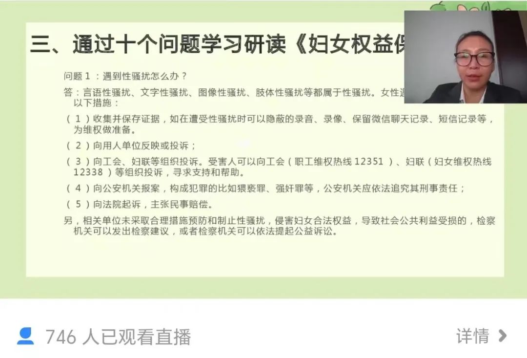 為增強(qiáng)女性職工的法律意識(shí),切實(shí)提高女職工的法治觀念和依法維權(quán)能力。3月10日下午,鄂爾多斯市中小企業(yè)公共服務(wù)平臺(tái)特邀中小企業(yè)志愿服務(wù)專家—哈晴(內(nèi)蒙古三恒律師事務(wù)所專職律師)開展以“情系女職工 法在你身邊”為主題的女職工線上普法培訓(xùn)活動(dòng)。在線觀看人數(shù)達(dá)700余人。