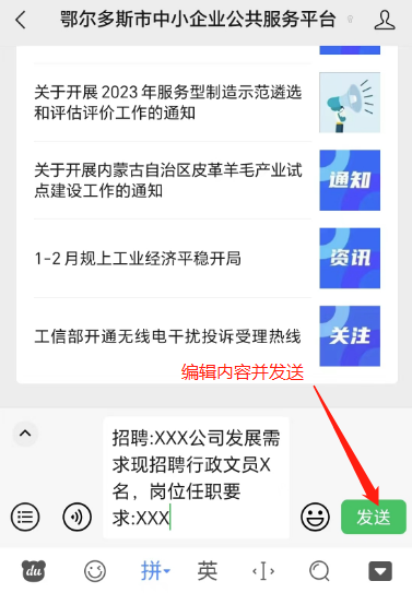 各企業(yè)可通過微信公眾號對話框向后臺留言,投稿內(nèi)容為:人才招聘、找訂單、人才培訓(xùn)等相關(guān)需求,歡迎各位企業(yè)積極投稿。