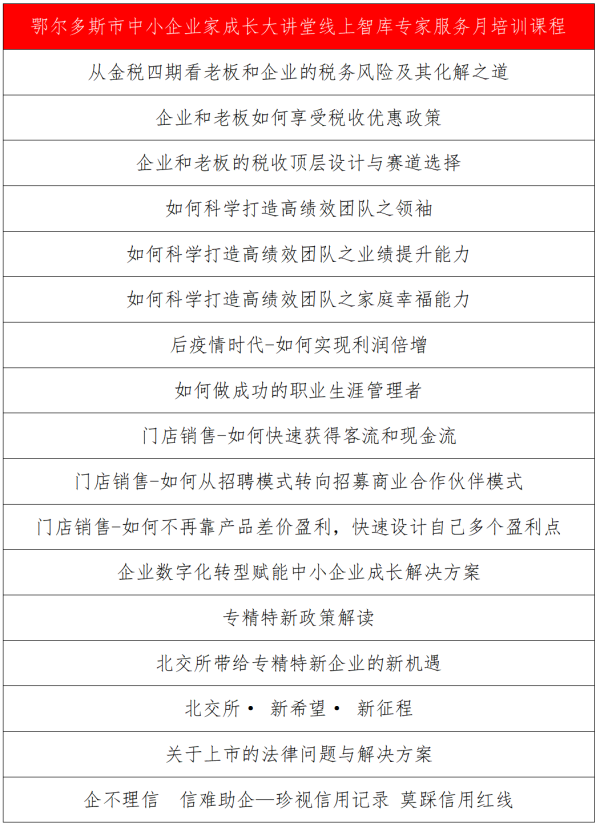 為進一步做好中小微企業(yè)服務工作,充分發(fā)揮鄂爾多斯市中小企業(yè)公共服務平臺培訓功能,激發(fā)中小微企業(yè)創(chuàng)新活力和發(fā)展動力,全面提升中小微企業(yè)在稅務籌劃、法律風險防范、市場營銷、企業(yè)經營、人才培養(yǎng)、團隊建設等各方面的能力,助力我市中小微企業(yè)健康平穩(wěn)發(fā)展,鄂爾多斯市工信局中小企業(yè)服務中心結合當前疫情防控工作實際,特舉辦“鄂爾多斯市中小企業(yè)家成長大講堂”線上智庫專家服務月培訓活動。具體活動詳情請持續(xù)關注我們的網站和公眾號,期待您的參與!