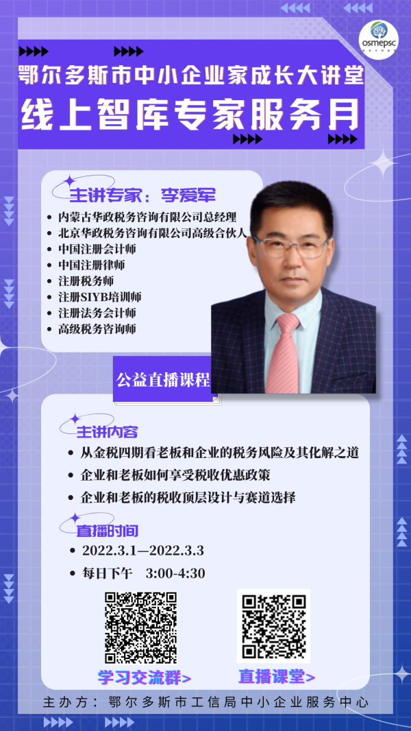 3月1日鄂爾多斯市中小企業(yè)家成長大講堂線上智庫專家服務月培訓開課啦!本次課程我們邀請到鄂爾多斯市中小企業(yè)公共服務平臺智庫專家、北京華政稅務集團高級合伙人、內蒙古華政稅務咨詢有限公司總經理李愛軍為大家直播授課。