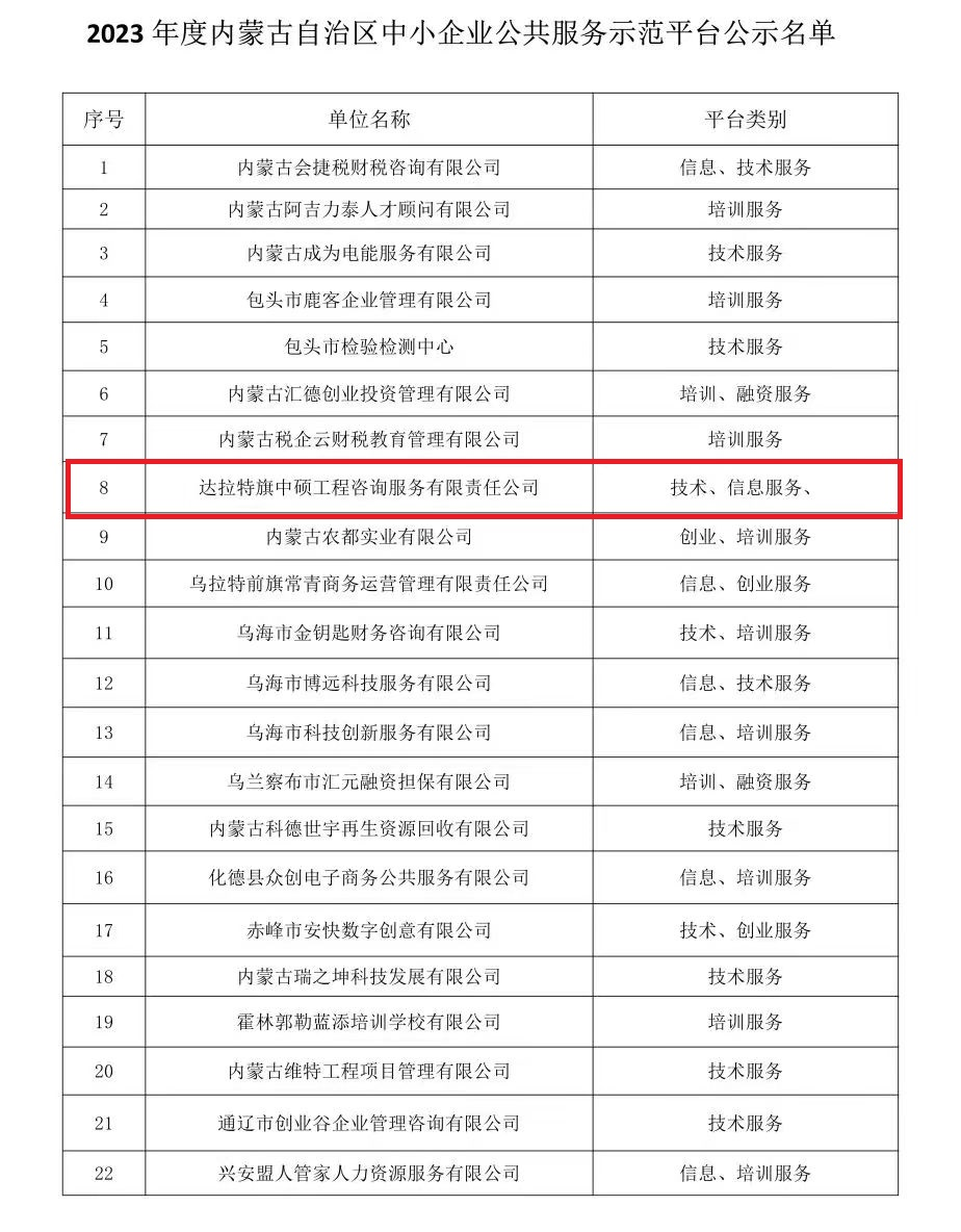 近日,自治區(qū)工信廳公示了2023年度自治區(qū)中小企業(yè)公共服務(wù)示范平臺(tái),我市達(dá)拉特旗中碩工程咨詢(xún)服務(wù)有限責(zé)任公司進(jìn)入公示名單。
