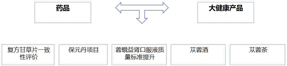 做好藥品核心品種的基礎(chǔ)上,積極開展技術(shù)創(chuàng)新、模式創(chuàng)新、業(yè)態(tài)創(chuàng)新,延伸發(fā)展大健康產(chǎn)業(yè)鏈,以地道特色藥材(肉蓯蓉、甘草等)為核心原料,憑借自身的藥品技術(shù)和質(zhì)量控制優(yōu)勢(shì),開發(fā)肉蓯蓉片、肉蓯蓉酒、肉蓯蓉茶、甘寶等系列大健康產(chǎn)品,以治未病之養(yǎng)生理念打造“一草一蓉”大健康產(chǎn)業(yè)鏈。