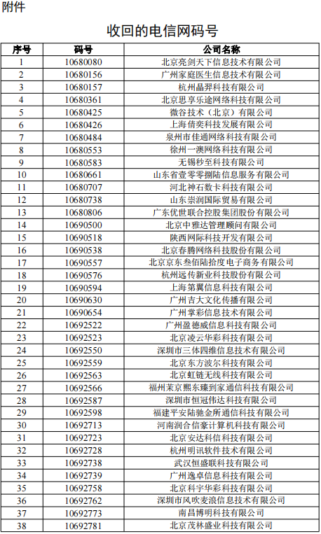 根據(jù)《電信網(wǎng)碼號資源管理辦法》有關(guān)規(guī)定,經(jīng)公示無異議,我部現(xiàn)收回部分電信網(wǎng)碼號(詳見附件)。上述碼號原使用單位應(yīng)當(dāng)做好碼號退回相關(guān)善后工作,相關(guān)基礎(chǔ)電信運營企業(yè)應(yīng)當(dāng)做好相應(yīng)網(wǎng)絡(luò)數(shù)據(jù)處理工作,確保網(wǎng)絡(luò)安全運行。