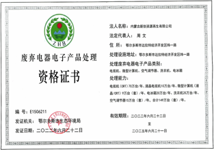 2014年10月獲得了鄂爾多斯市環(huán)境保護(hù)局建設(shè)項(xiàng)目環(huán)境保護(hù)驗(yàn)收和廢棄電器電子產(chǎn)品處理企業(yè)資格審查取得處理資格證書,核準(zhǔn)年拆解處理廢舊電器電子產(chǎn)品149萬(wàn)臺(tái)(套)。