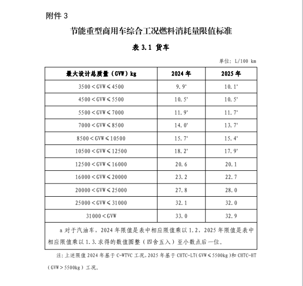 (二)項(xiàng)中涉及的節(jié)能乘用車、輕型商用車、重型商用車綜合工況燃料消耗量限值標(biāo)準(zhǔn)進(jìn)行更新,具體要求見本公告附件1、附件2、附件3。