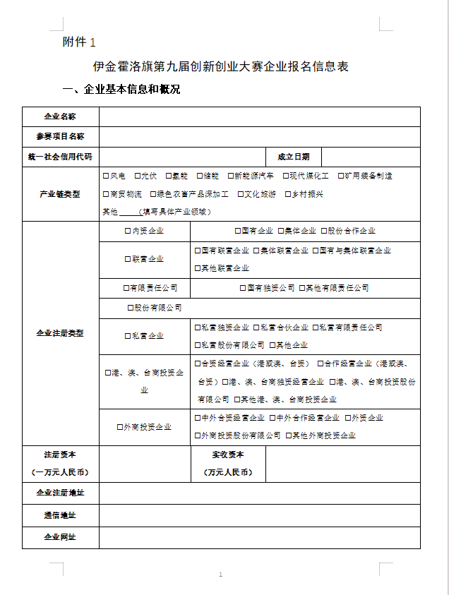 (一)請(qǐng)參賽企業(yè)按照要求,填寫《伊金霍洛旗第九屆創(chuàng)新創(chuàng)業(yè)大賽企業(yè)報(bào)名信息表》(見(jiàn)文末附件)、《伊金霍洛旗第九屆創(chuàng)新創(chuàng)業(yè)大賽參賽承諾書》(見(jiàn)文末附件),并對(duì)所填信息的準(zhǔn)確性和真實(shí)性負(fù)責(zé)。